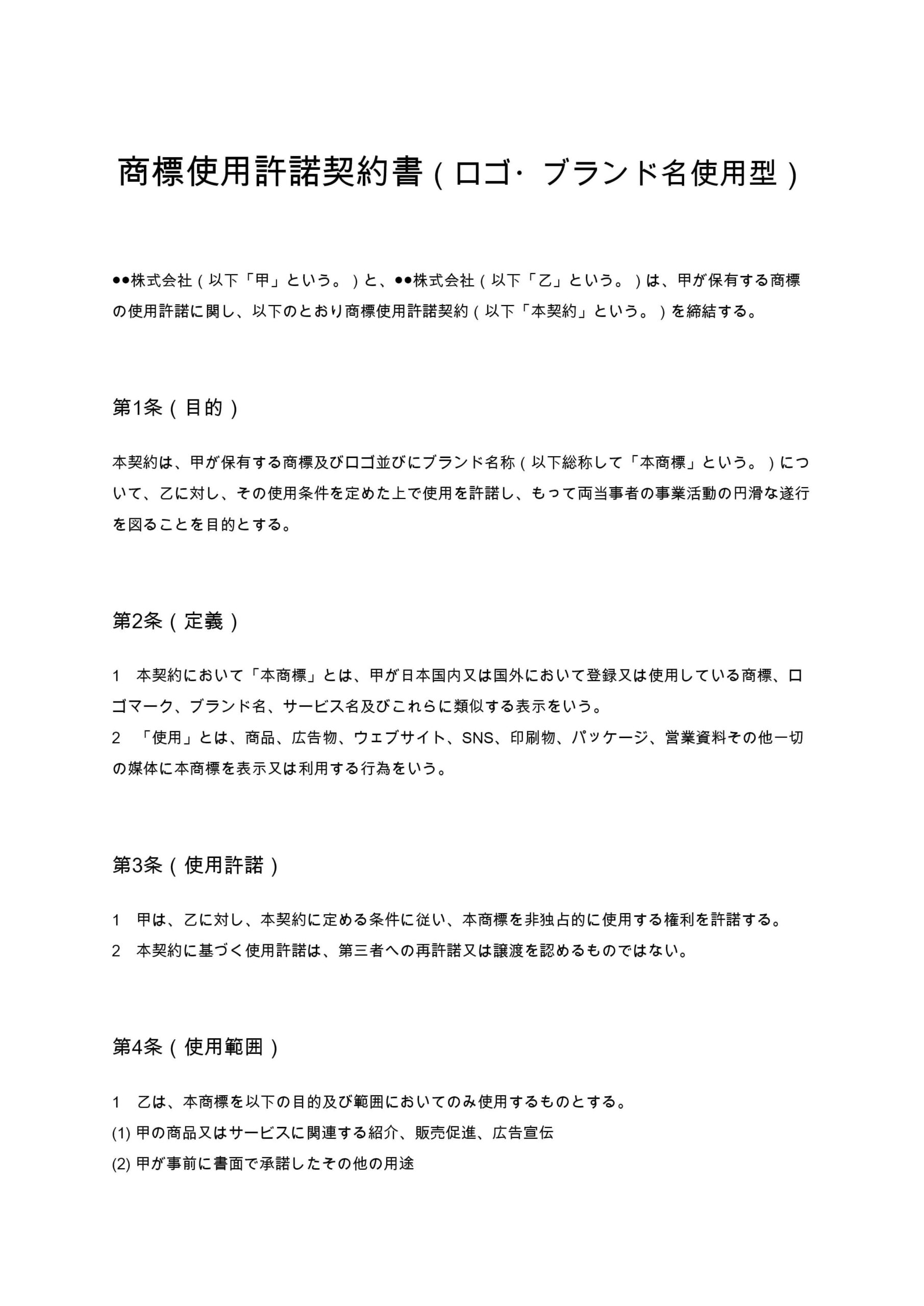 商標使用許諾契約書(ロゴ・ブランド名使用型)は、企業が保有するロゴやブランド名などの商標を、第三者に一定条件のもとで使用させるための契約書です。広告・Web掲載・商品PRなどにおける使用範囲や禁止事項...