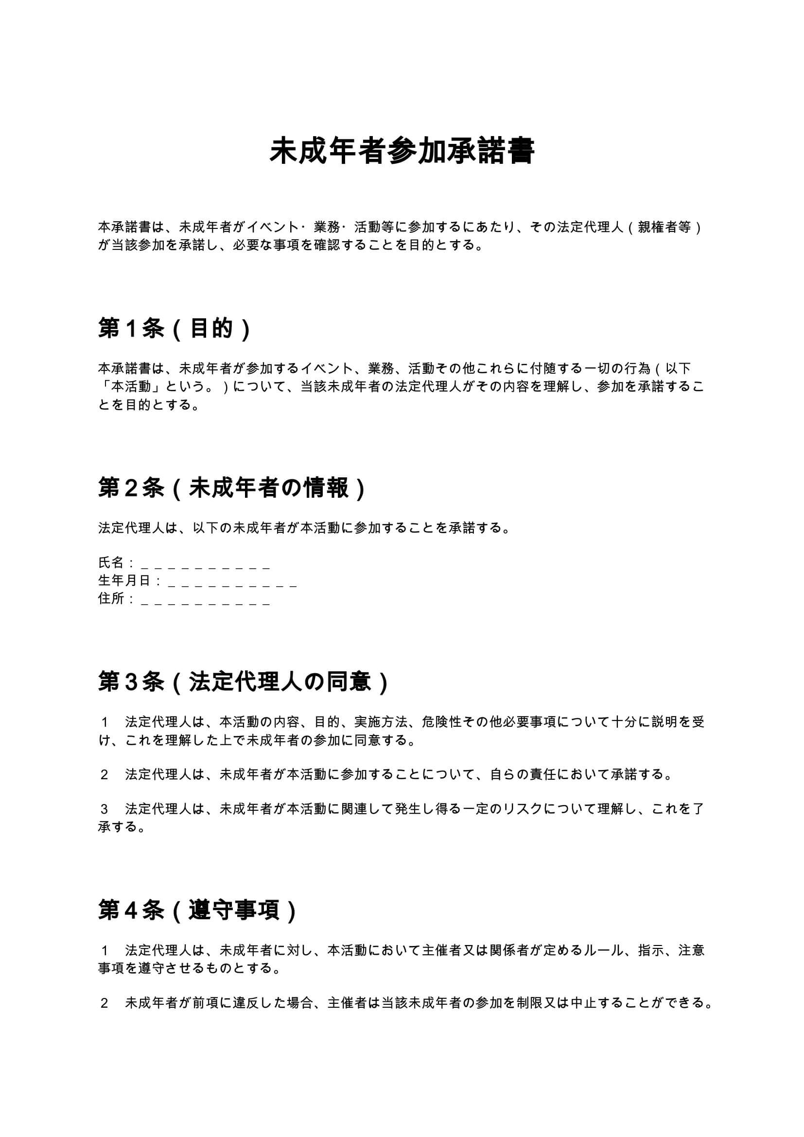 ボランティア活動に参加する際の条件や責任範囲を明確にする同意書のひな形です。無償性の確認、事故時の責任、肖像権、個人情報の取扱いなど、イベントや地域活動で必要な基本条項を網羅しています。 ...