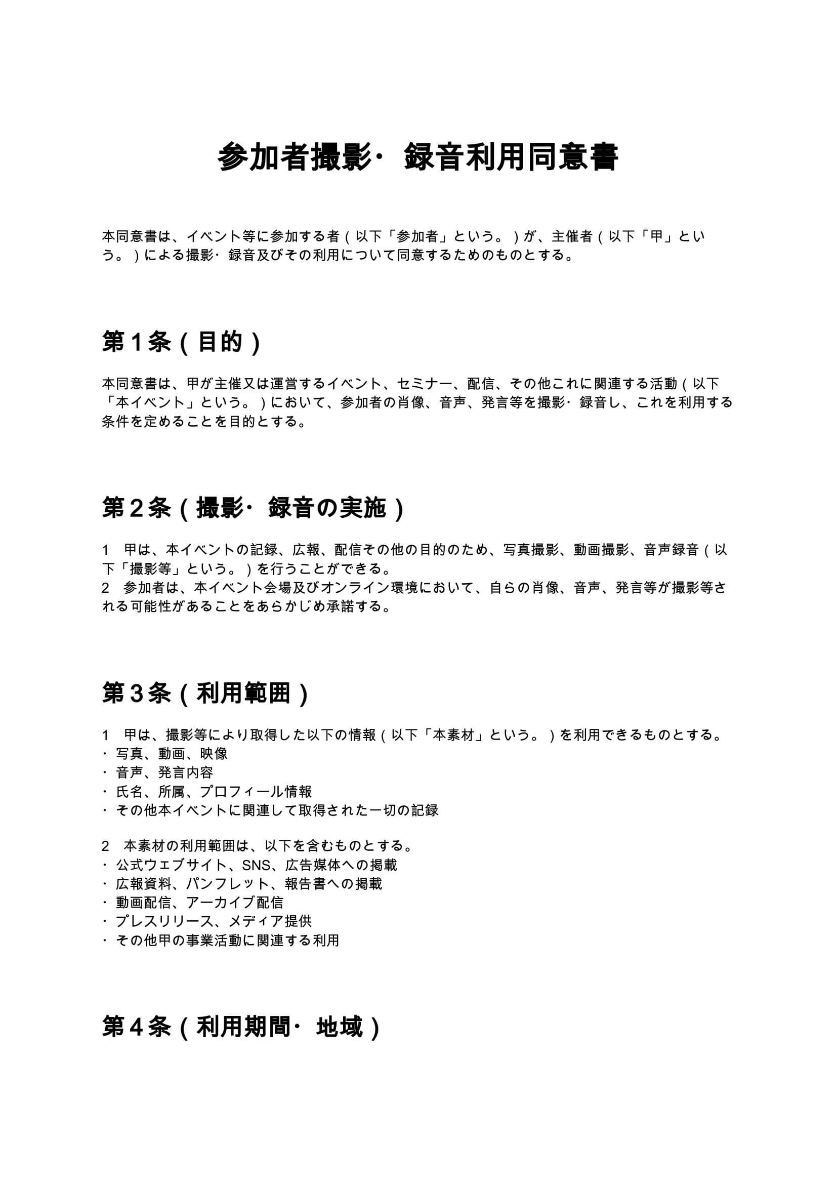 参加者の写真・動画・音声の撮影および利用について同意を取得するための同意書ひな形です。イベント、セミナー、配信、広報活動に対応し、肖像権、利用範囲、無償利用、第三者提供、撤回条件など実務上重要な条項を...