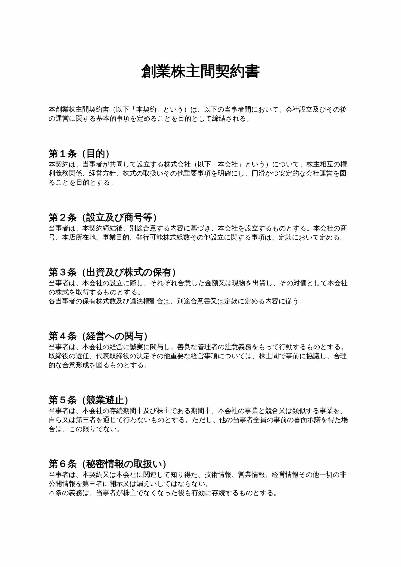 創業株主間契約書は、会社設立時における株主同士の権利義務、株式の譲渡制限、経営への関与、秘密情報の取扱いなどを定める契約書です。創業メンバー間の認識齟齬や将来の紛争を防ぎ、安定した会社運営の基盤を築く...
