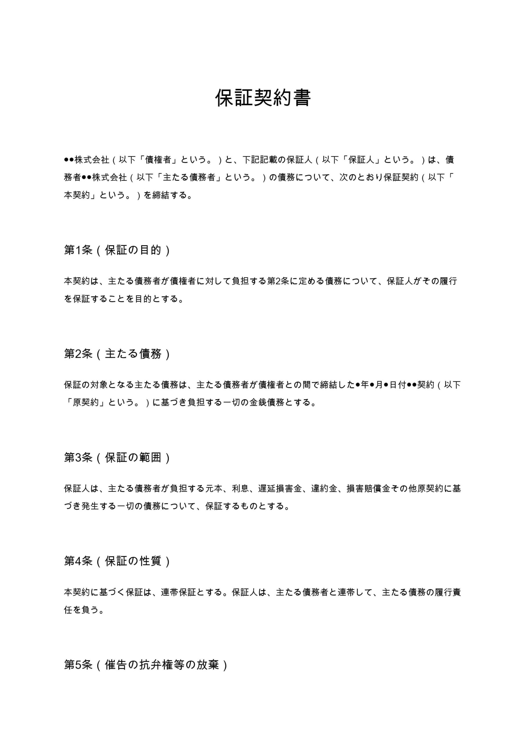 保証契約書は、主たる債務者が負う金銭債務について、第三者である保証人が履行を保証するための契約書です。取引先との信用補完や融資、業務委託契約に付随して用いられることが多く、債権回収リスクを軽減する役割...