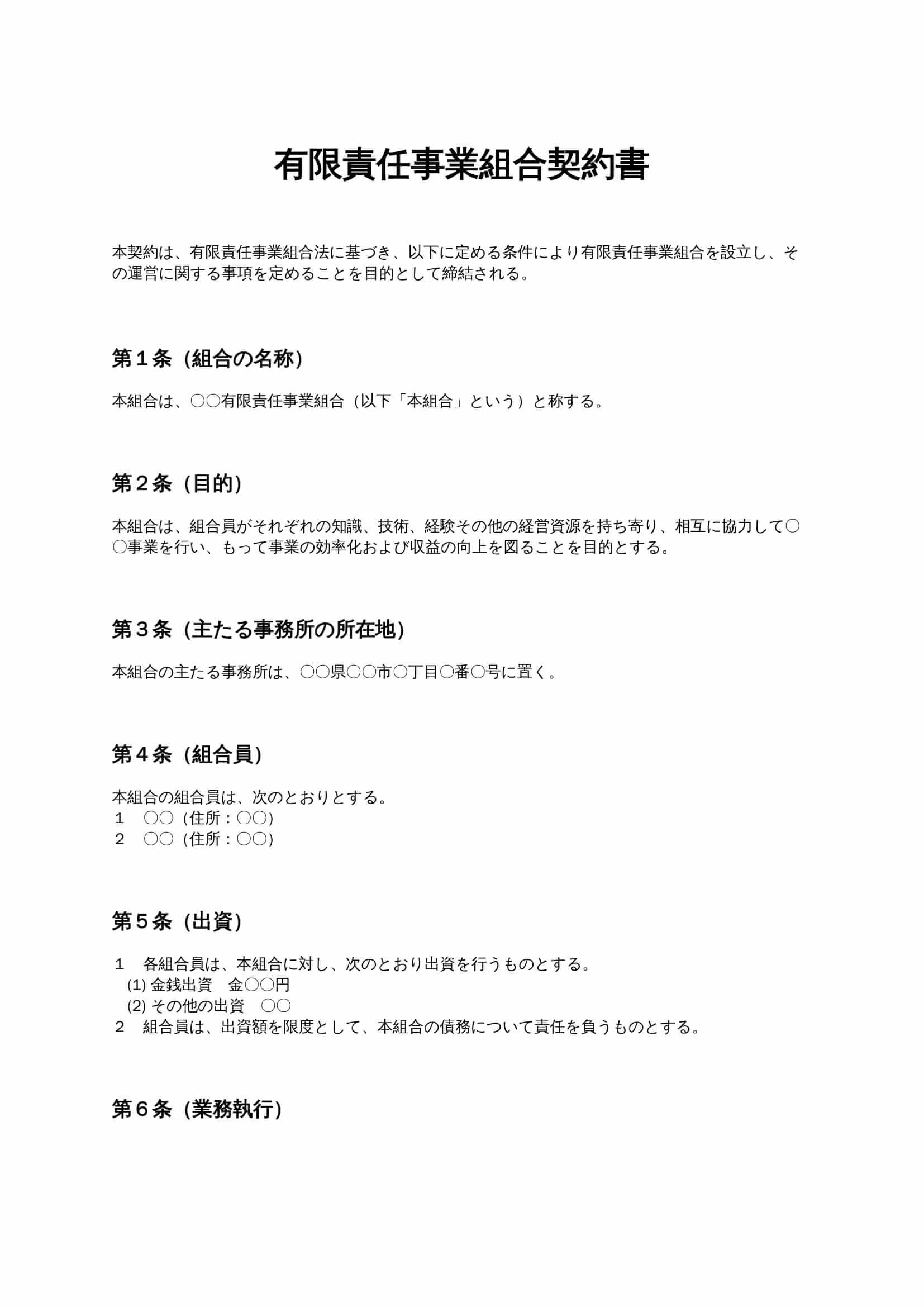 有限責任事業組合契約書は、複数の事業者が有限責任のもとで共同事業を行うために締結する契約書です。出資内容、業務執行、利益配分、脱退や解散条件などを明確に定めることで、事業運営上のトラブルを防止できます...