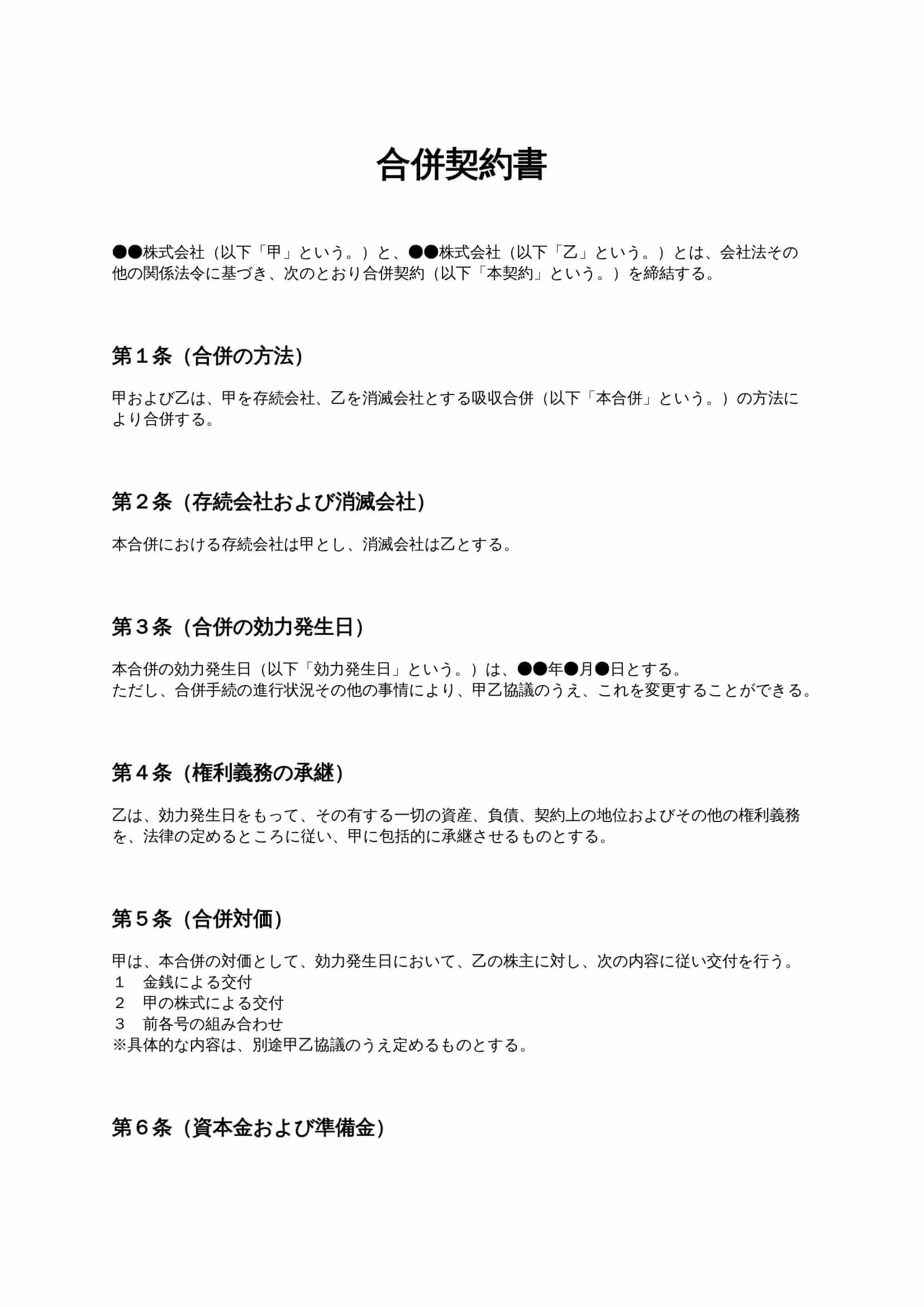 合併契約書(吸収合併)は、2社以上の会社が合併を行う際に、存続会社・消滅会社、合併方法、効力発生日、権利義務の承継などを定める契約書です。会社法に基づく合併手続きを進めるための基本書式として利用されま...