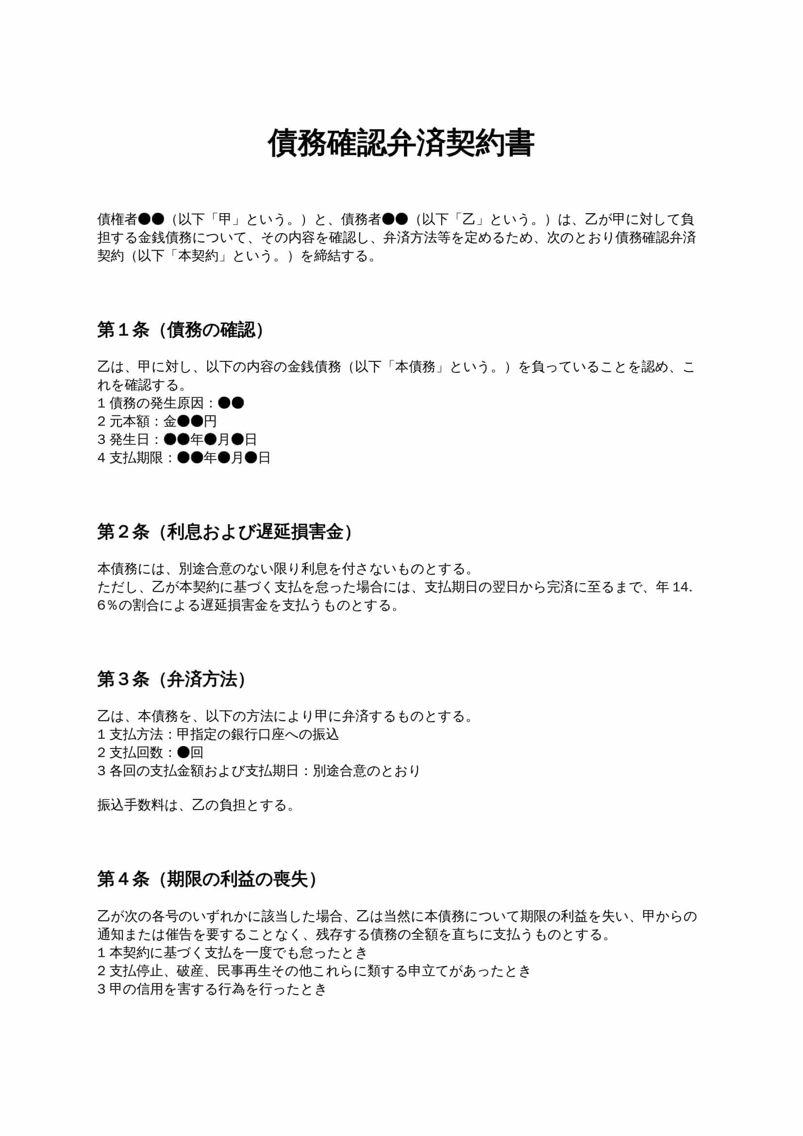 債務確認弁済契約書は、債務者が債権者に対して負っている金銭債務の内容を明確に確認し、弁済方法や期限の利益喪失などを定める契約書です。過去の取引や未払金の整理、分割払いの合意を行う際などに用いられます。...