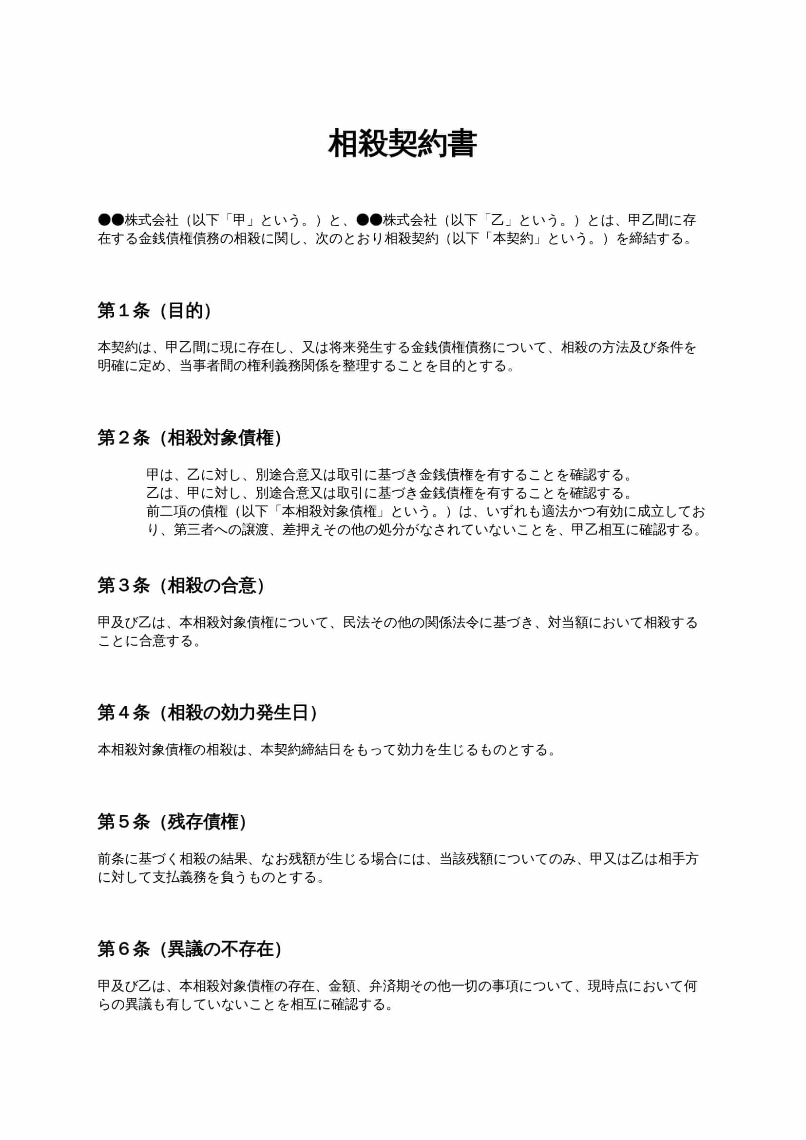 相殺契約書は、取引先同士が互いに有する金銭債権債務を対当額で相殺し、支払関係を整理するための契約書です。継続取引や複数の取引が並行する場合に、支払漏れや請求トラブルを防止する目的で利用されます。...