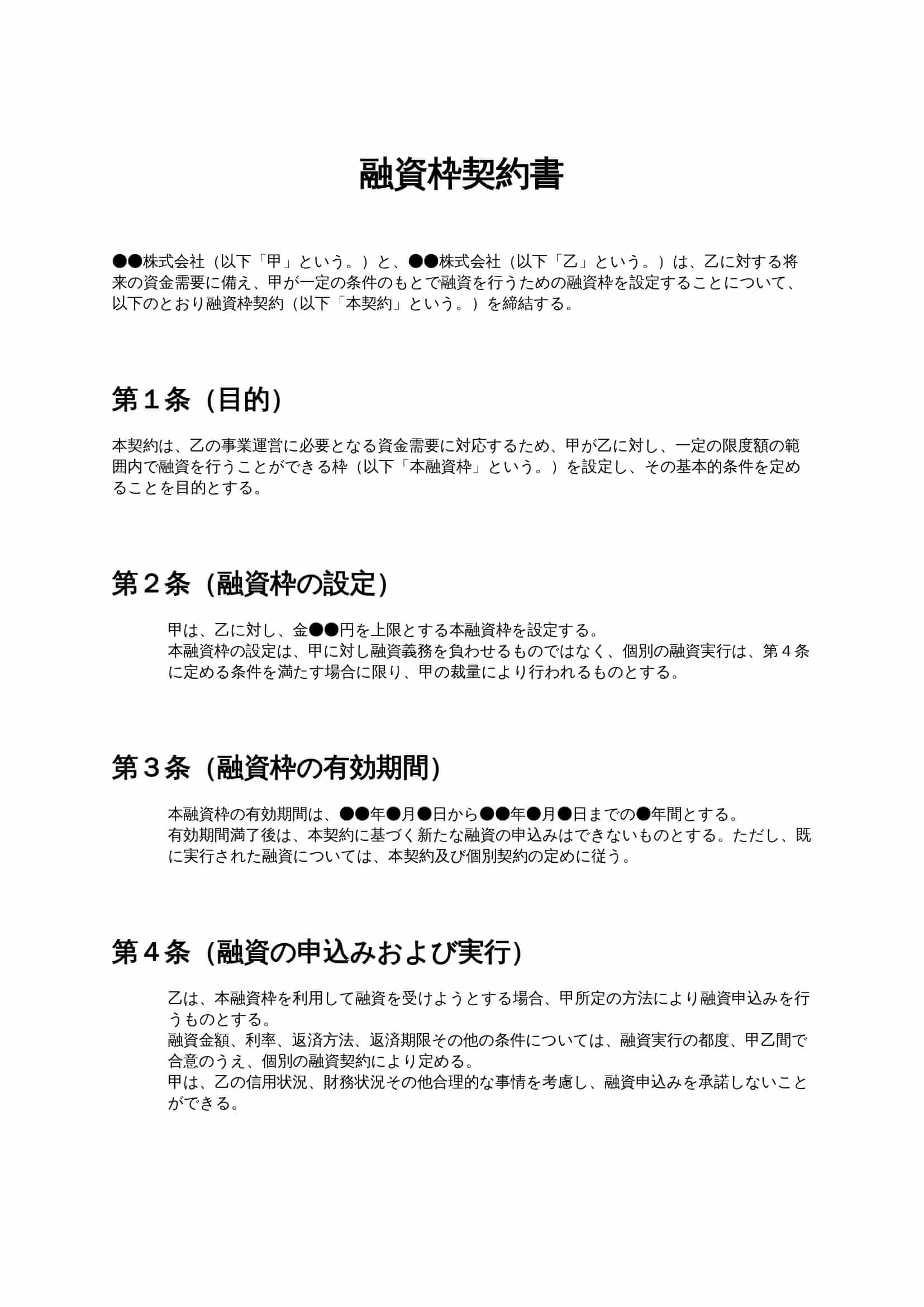 融資枠契約書は、将来の資金需要に備えて、金融機関や取引先との間であらかじめ融資限度額や基本条件を定める契約書です。資金調達の柔軟性を確保しつつ、個別融資ごとの条件は別途合意する前提で利用されます。...