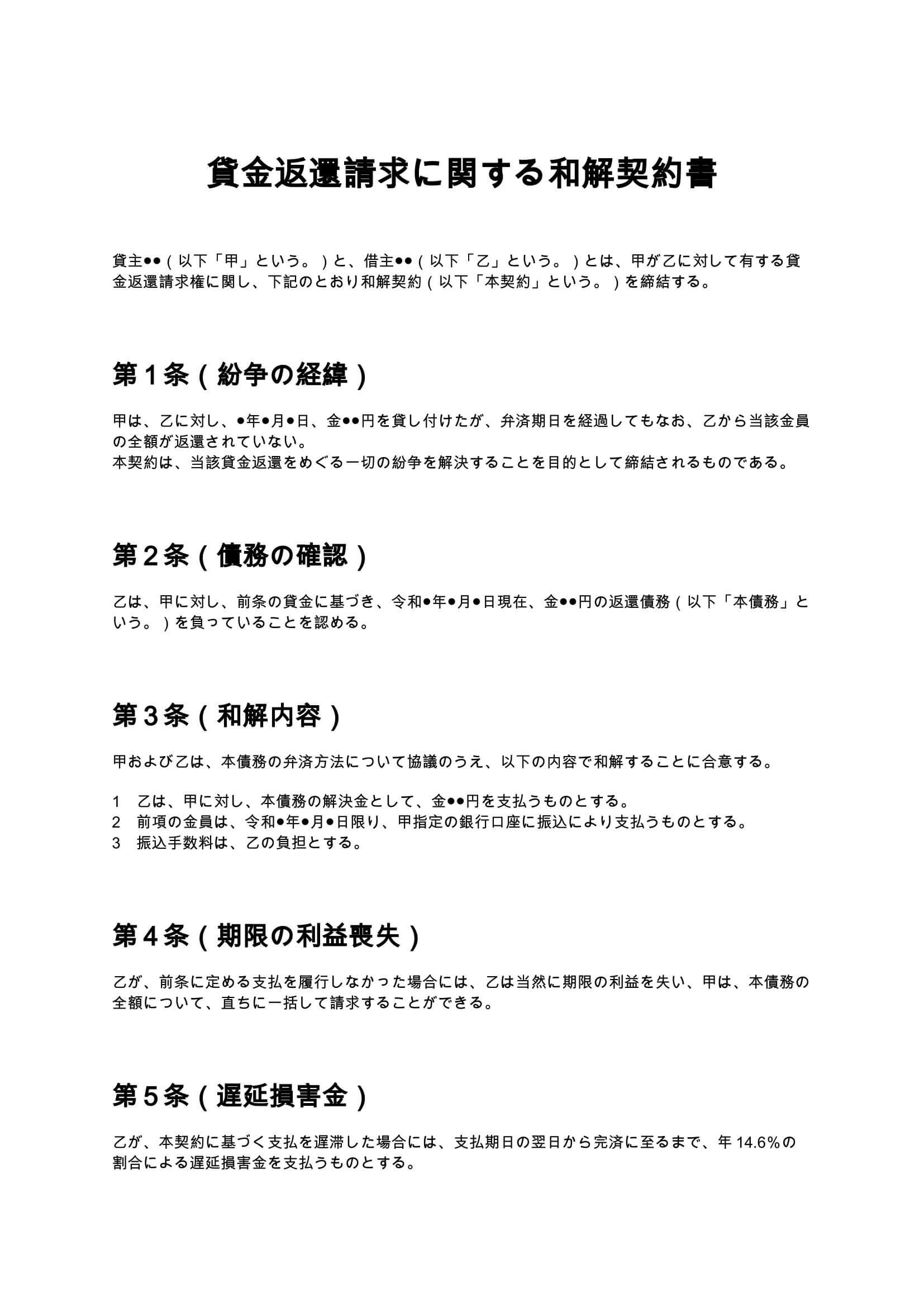 貸金返還請求における和解契約書は、貸主と借主の間で未返済の貸金について返済方法や解決金額を合意し、紛争を円満に解決するための契約書です。訴訟前後を問わず、金銭トラブルの早期解決に利用されます。...