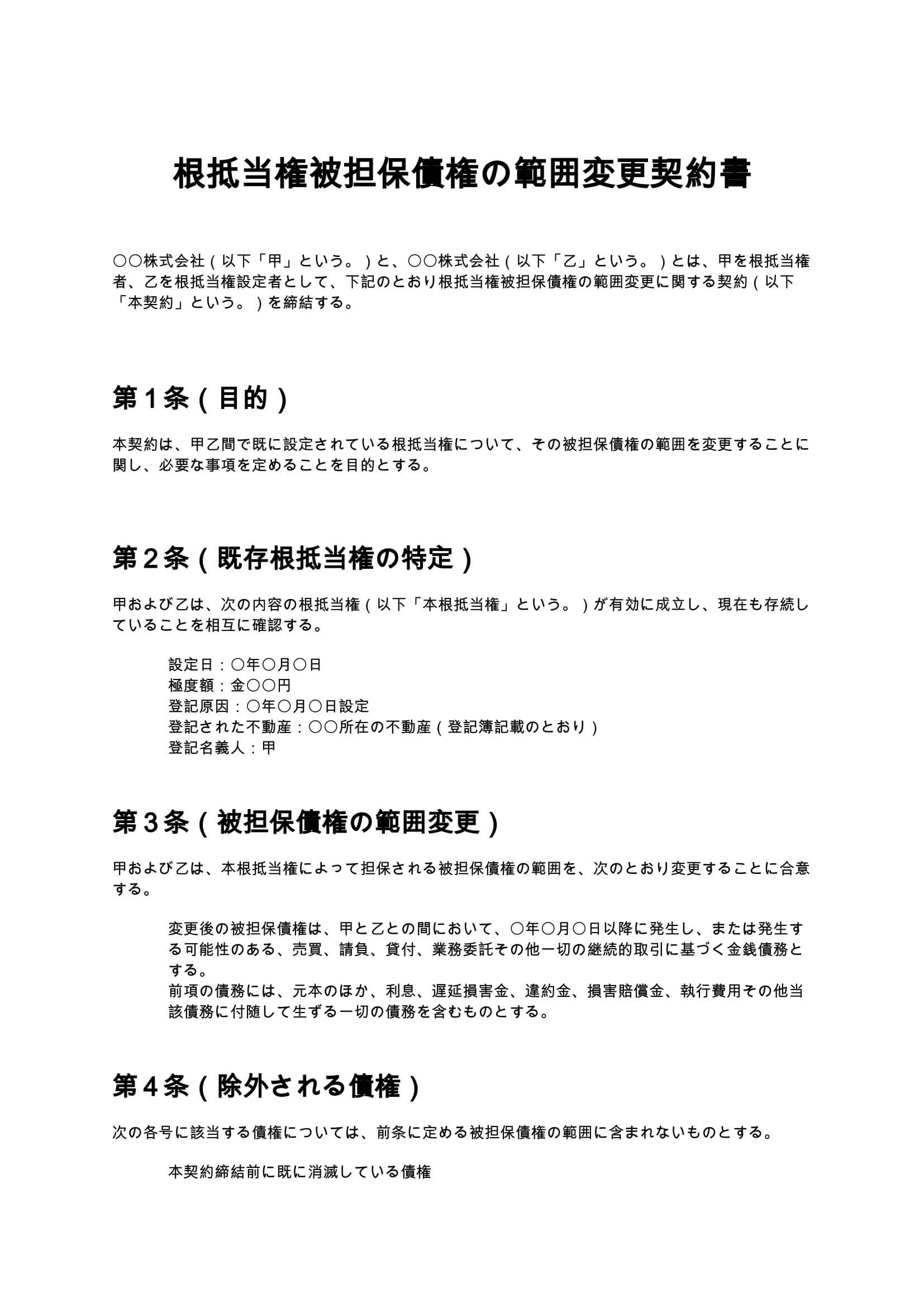 根抵当権被担保債権の範囲変更契約書は、既に設定されている根抵当権について、担保する債権の内容や取引範囲を見直し・変更する際に用いる契約書です。継続取引の内容変更や取引拡大時の法的整理に適しています。 ...