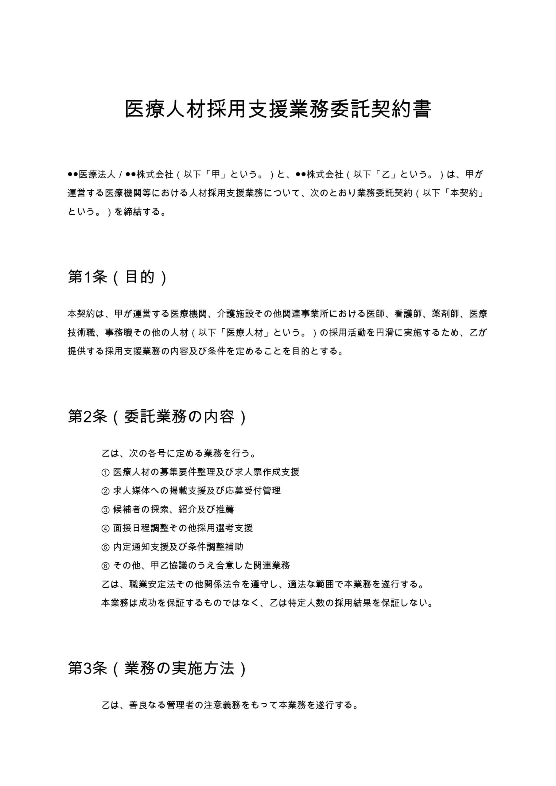 医療機関が外部事業者に医師・看護師等の採用支援を委託する際の契約書ひな形です。成功報酬、早期退職時の返金、個人情報保護、秘密保持など実務上重要な条項を網羅しています。...
