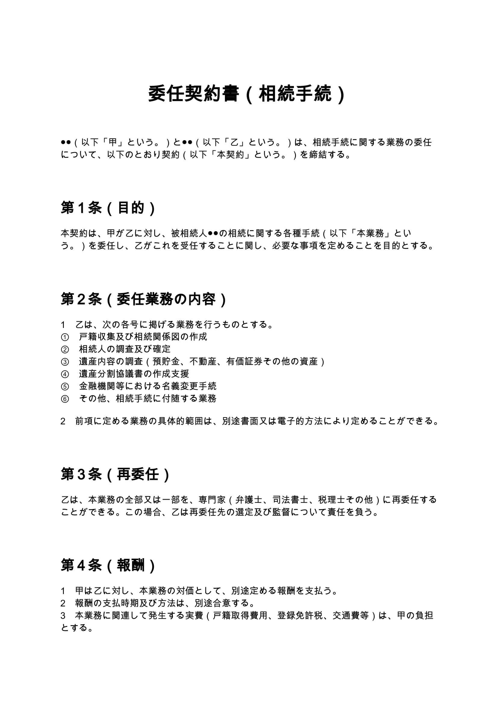 相続手続に関する各種業務を専門家へ委任する際に使用できる委任契約書のひな形です。戸籍収集、遺産調査、名義変更など相続実務に必要な業務範囲や報酬、責任範囲を整理しています。 ...