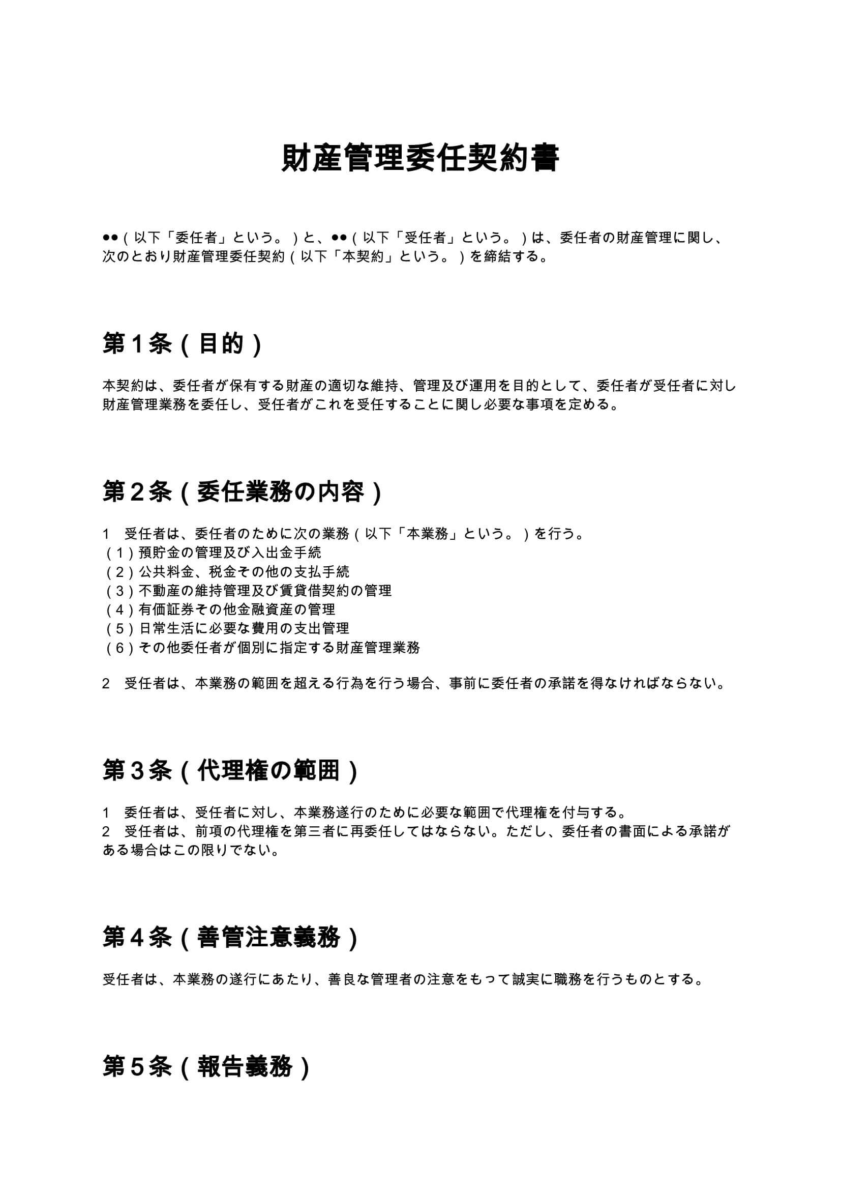 財産管理委任契約書は、高齢者や多忙な個人が自らの財産管理を第三者に委任する際に使用する契約書です。預貯金管理、不動産管理、支払業務などを対象とし、代理権の範囲や責任、報告義務を明確に定めています。...