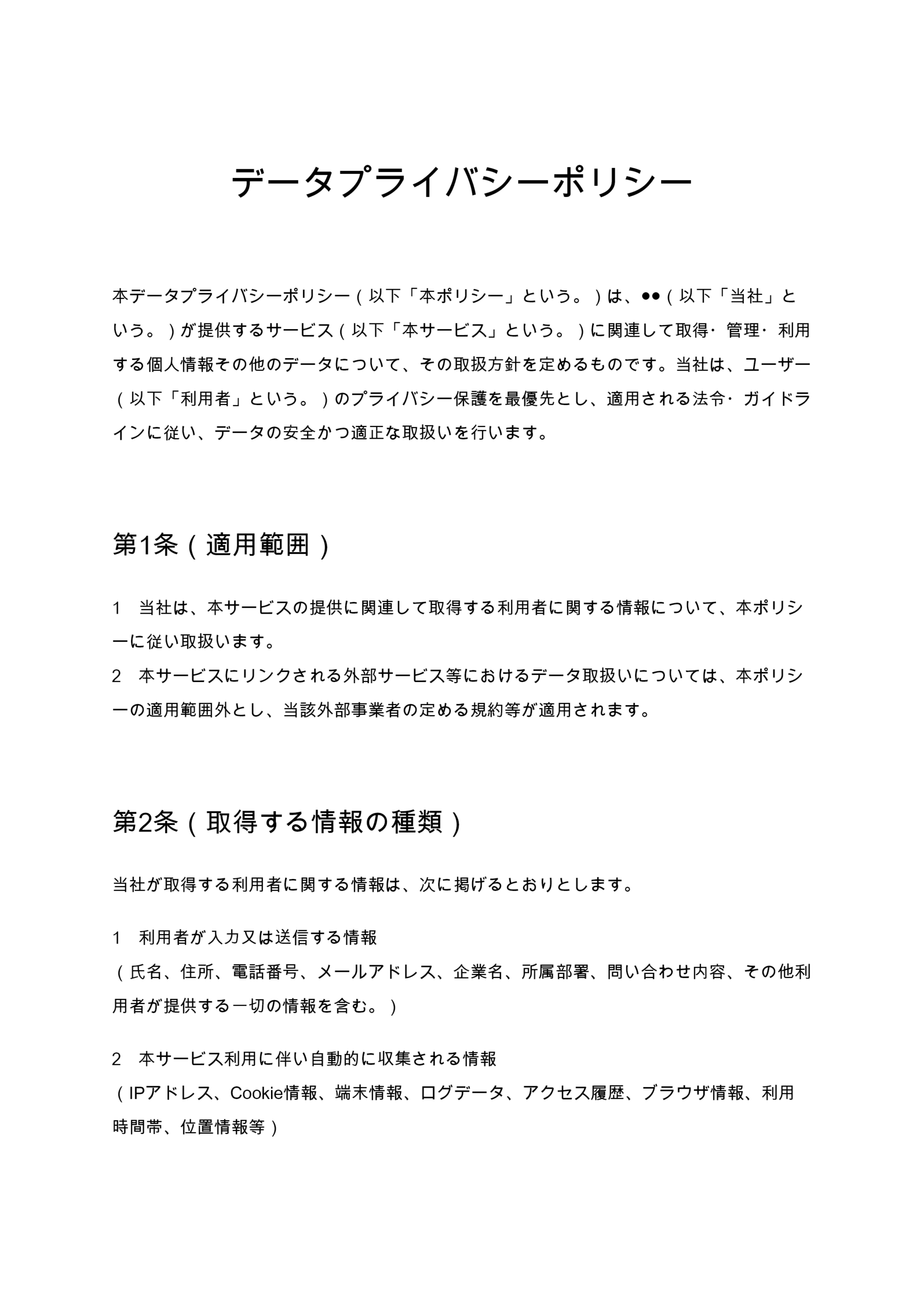 データプライバシーポリシーは、企業が利用者から取得する個人情報やアクセスデータの取扱方針を明示する文書です。データの取得内容、安全管理措置、第三者提供、Cookie利用などを明確にし、法令遵守とユーザ...