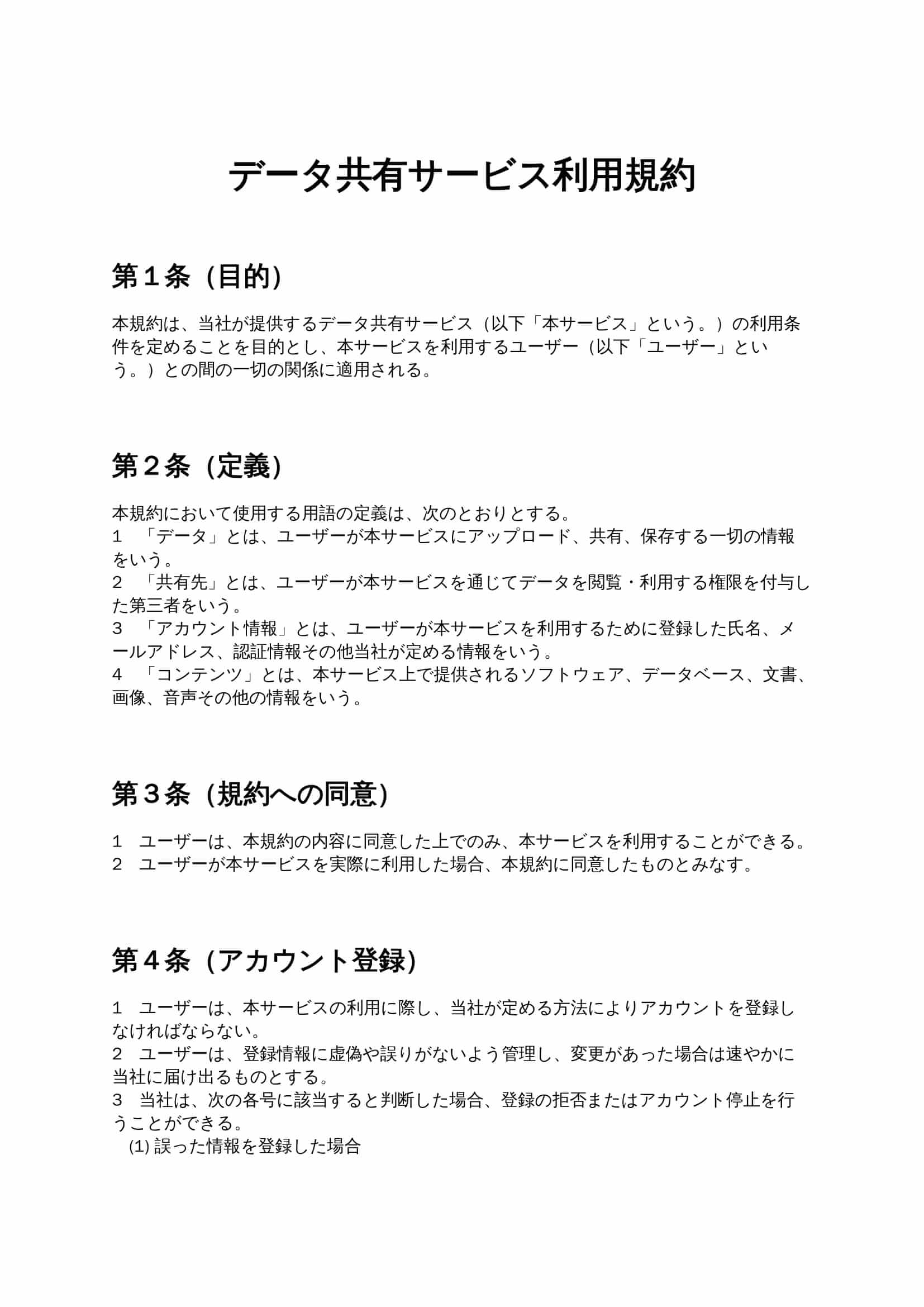 データ共有サービス利用規約は、クラウド上でデータをアップロード・保存・共有するユーザーとサービス提供者の間で、利用条件・禁止事項・データ管理責任・免責・知的財産権などを定める文書です。安全なデータ共有...