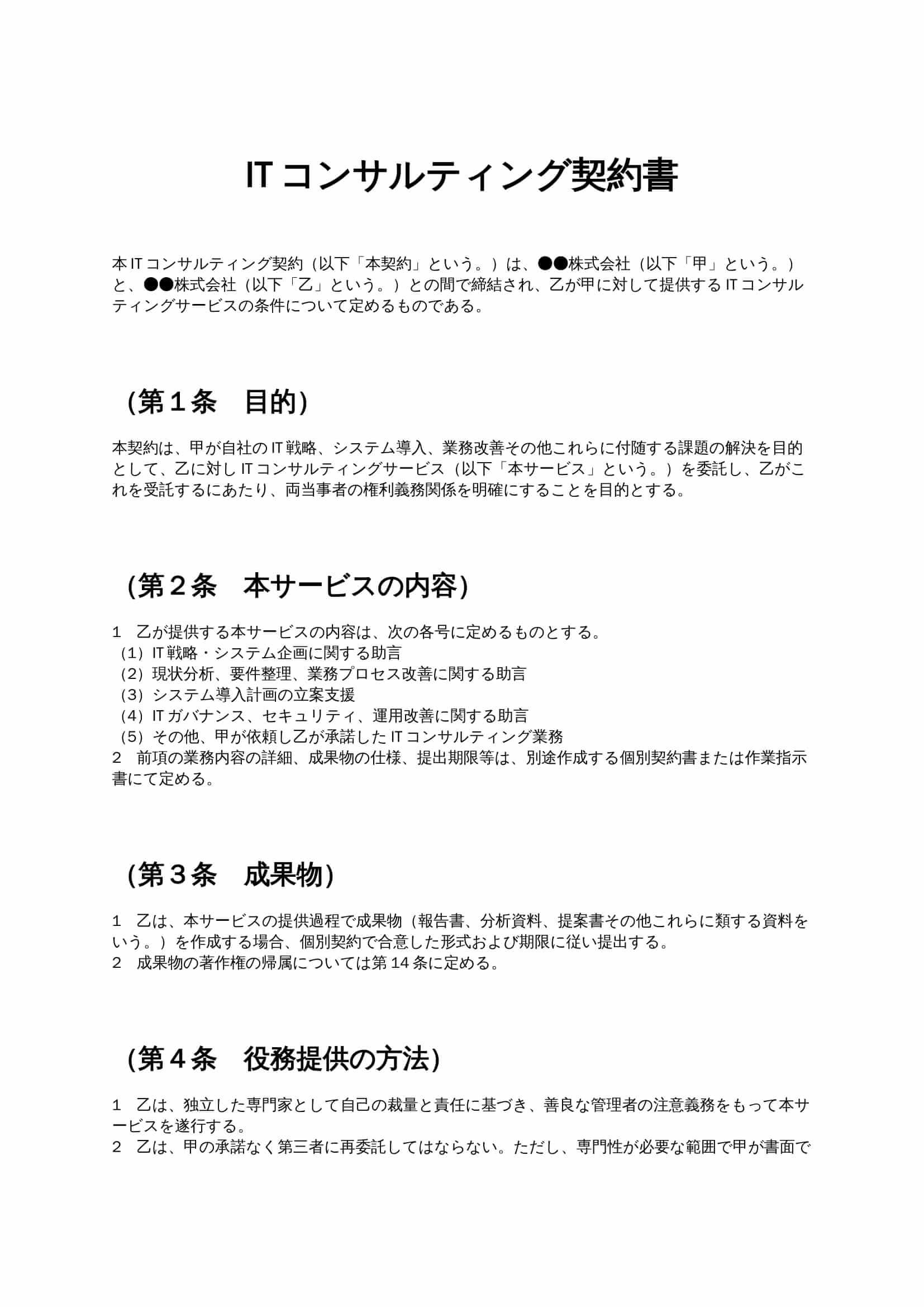 ITコンサルティング契約書は、企業が専門家にIT戦略立案、システム導入支援、業務改善などを委託する際の条件を定める文書です。成果物の範囲、報酬、知的財産権、秘密保持、責任範囲を明確化し、トラブル防止と...