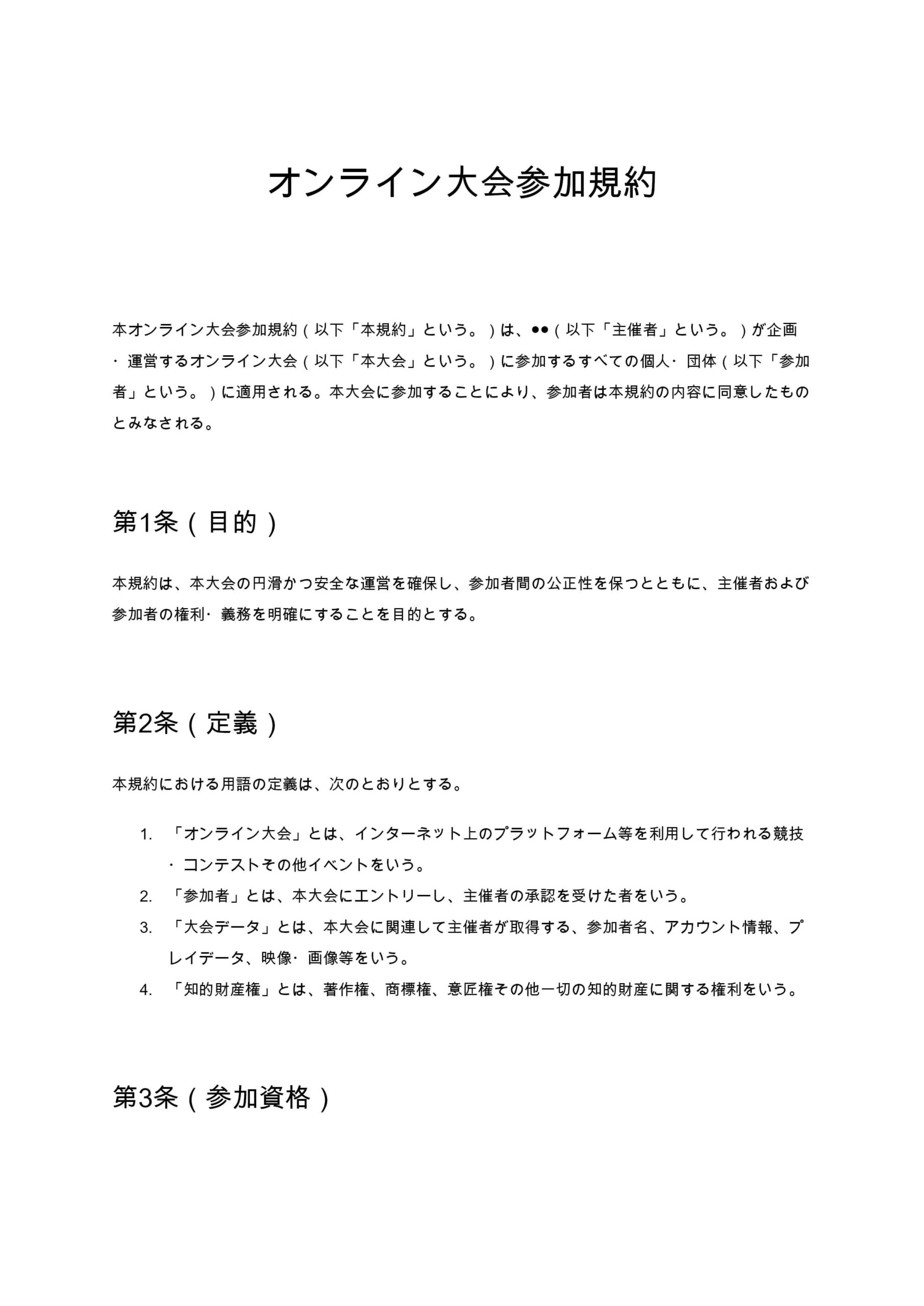 オンライン大会参加規約は、主催者が企画するインターネット上の競技イベントにおいて、参加条件、不正行為の禁止、賞金・賞品の取扱い、個人情報や大会データの利用範囲などを包括的に定める規約です。大会運営の公...