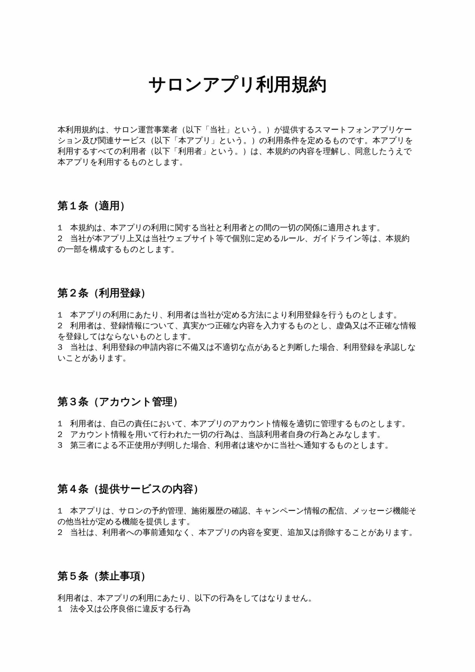 サロンアプリ利用規約は、美容室やエステ、ネイル、脱毛サロンなどが提供する公式アプリの利用条件や禁止事項、免責範囲を明確に定め、ユーザーとのトラブルを未然に防ぐための利用規約ひな形です。 ...