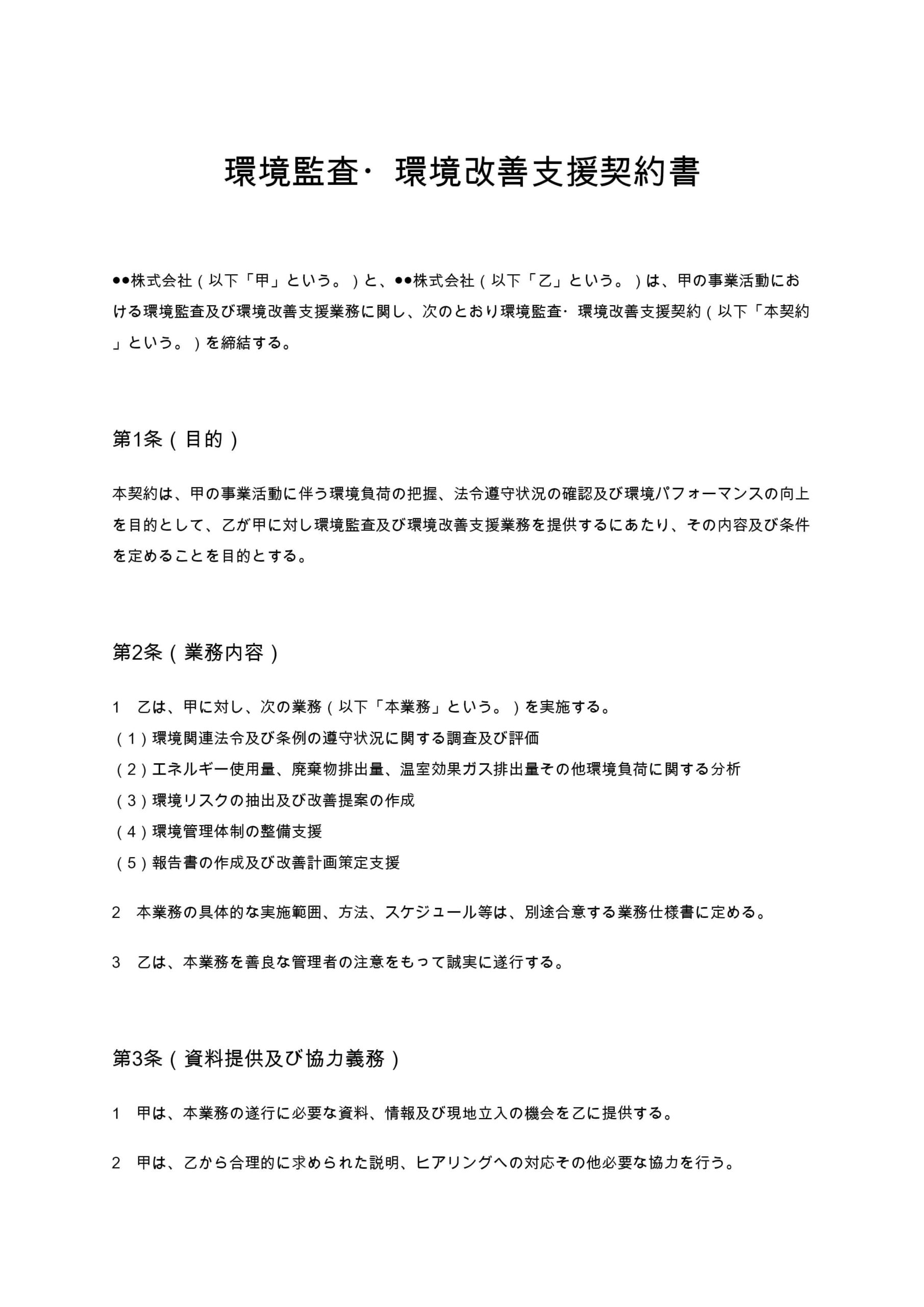環境監査・環境改善支援契約書は、企業の環境法令遵守状況や環境負荷を評価し、改善提案や体制整備を支援する業務内容と責任範囲を明確に定める契約書です。...