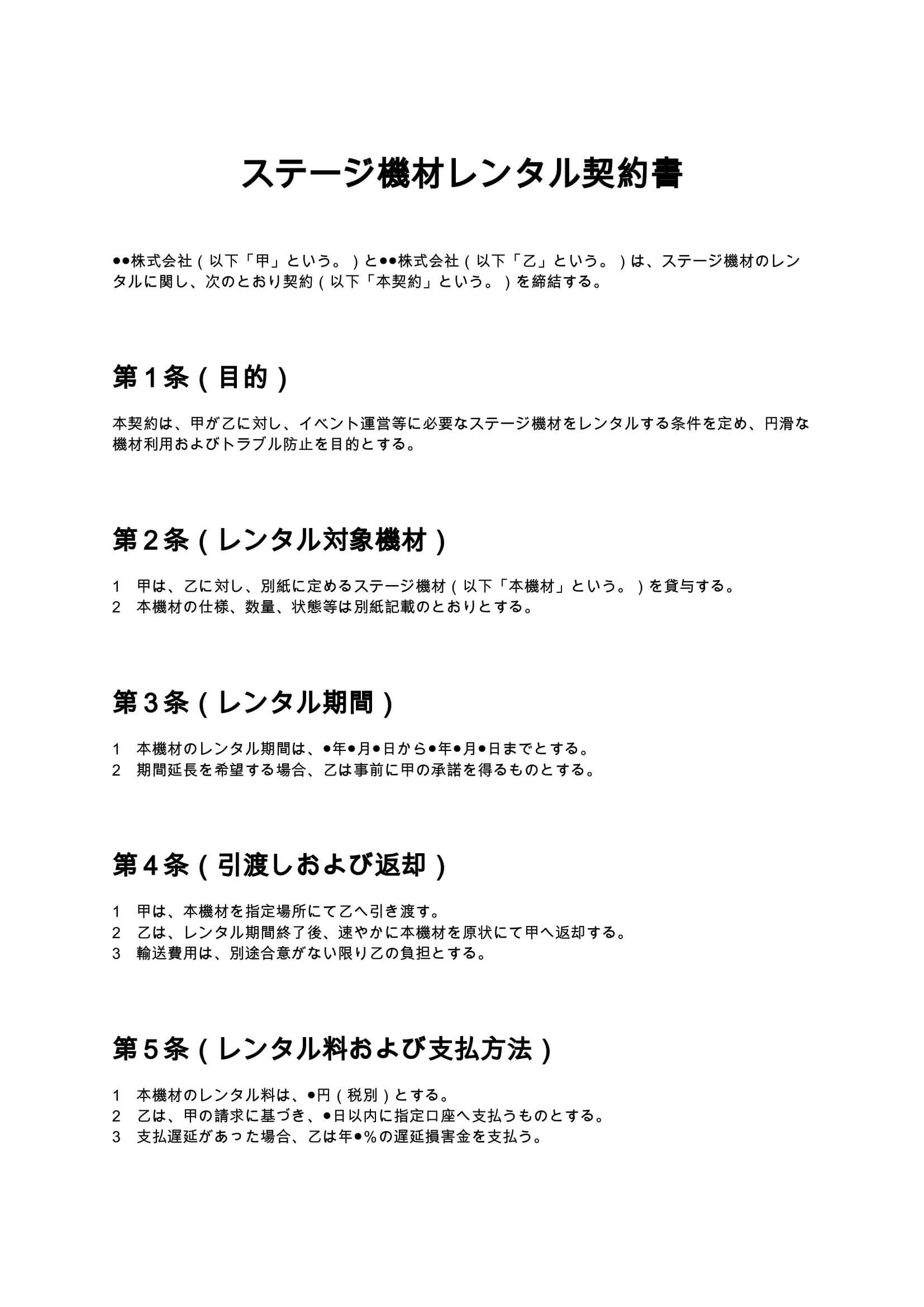 ステージ機材レンタル契約書は、イベントやライブ等で使用する音響・照明・舞台機材を貸し出す際の条件を定める契約書です。レンタル期間、破損時の責任、設営・操作、保険など実務上重要なポイントを整理しています...