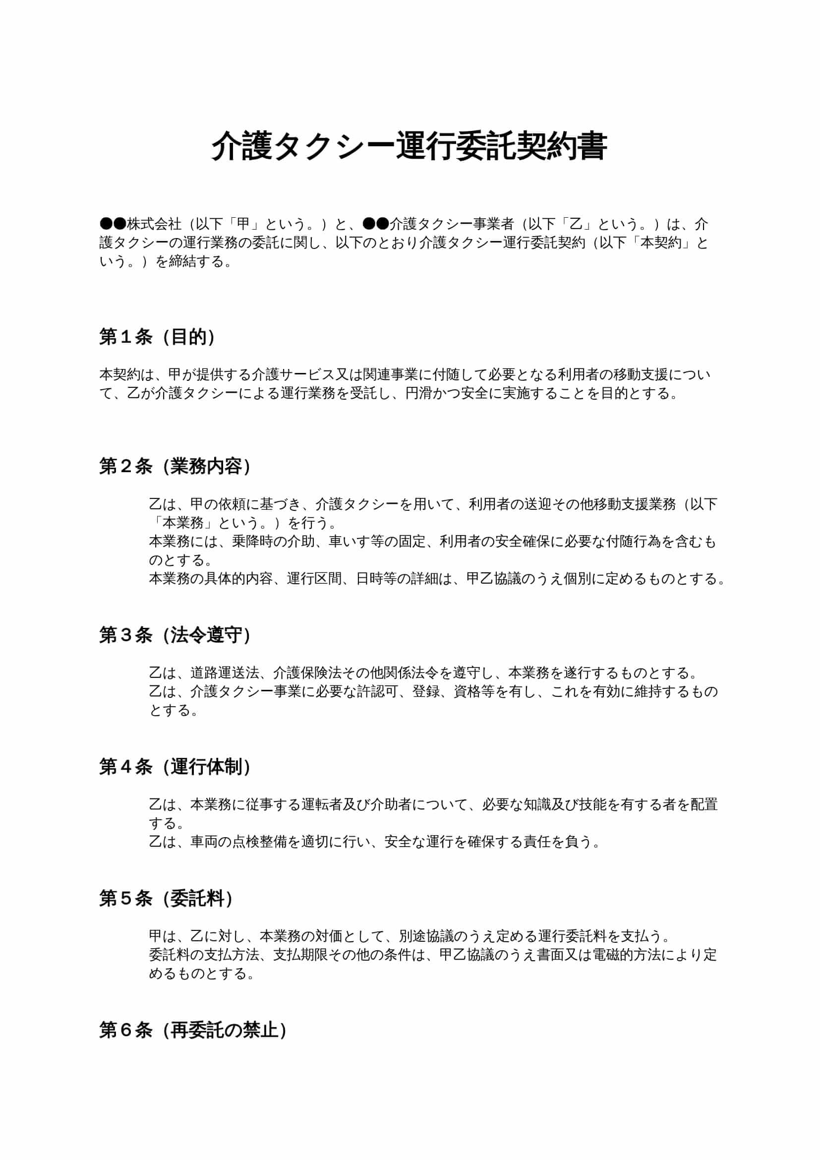 介護タクシー運行委託契約書は、介護事業者が外部の介護タクシー事業者に対し、利用者の送迎や移動支援業務を委託する際に用いる契約書です。運行内容、責任範囲、個人情報の取扱いを明確にし、トラブル防止を図りま...