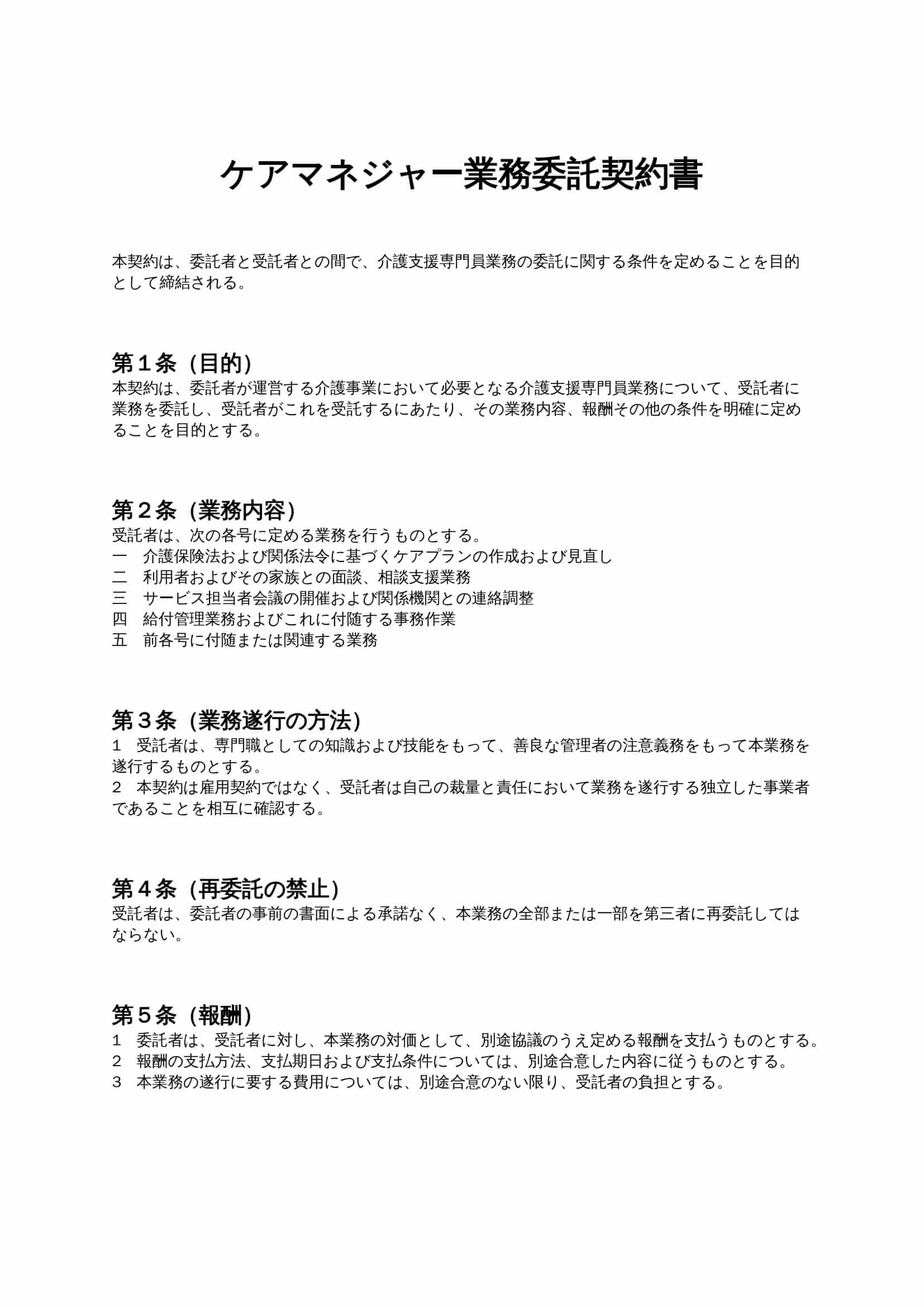 ケアマネジャー業務委託契約書は、居宅介護支援事業所等が介護支援専門員に対してケアプラン作成や相談支援業務を委託する際に、業務内容・報酬・責任範囲を明確化するための契約書ひな形です。...
