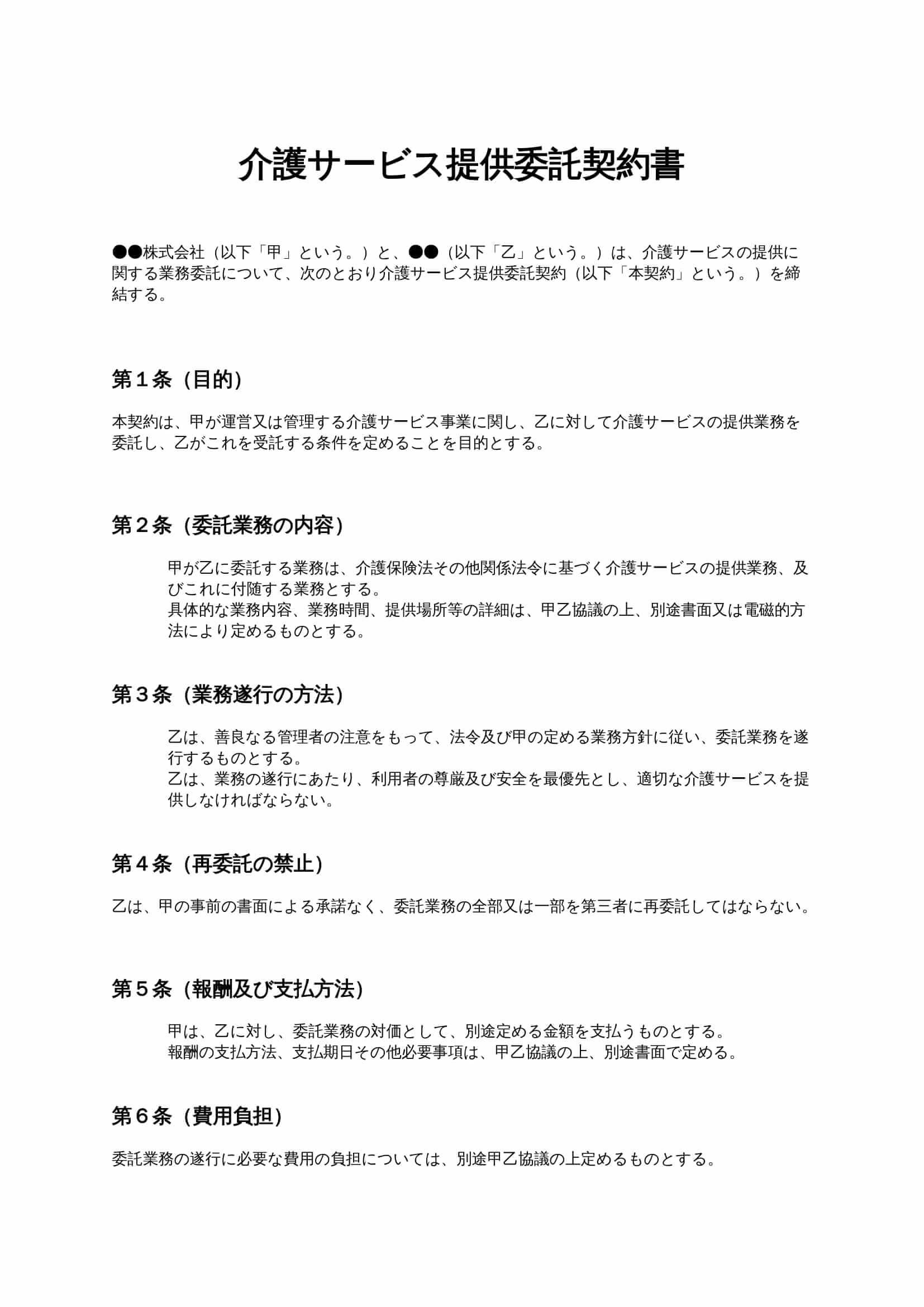 通所介護(デイサービス)業務委託契約書は、介護事業者が介護職員や外部事業者に対してデイサービス業務の一部を委託する際に、業務内容や責任範囲、報酬条件などを明確に定めるための契約書ひな形です。 ...