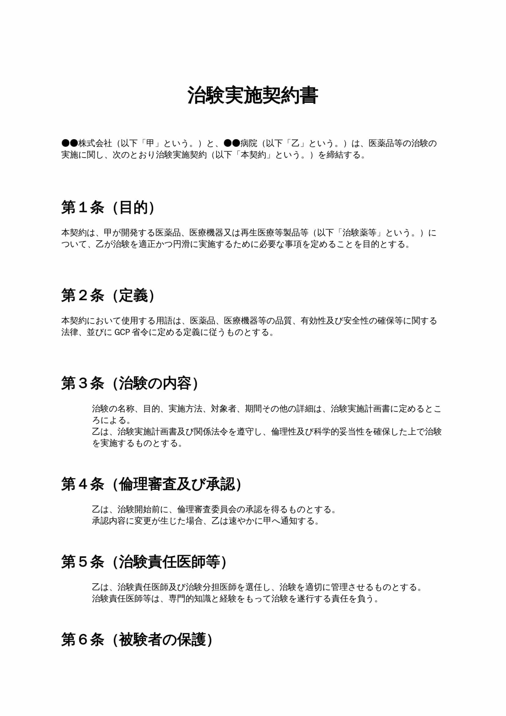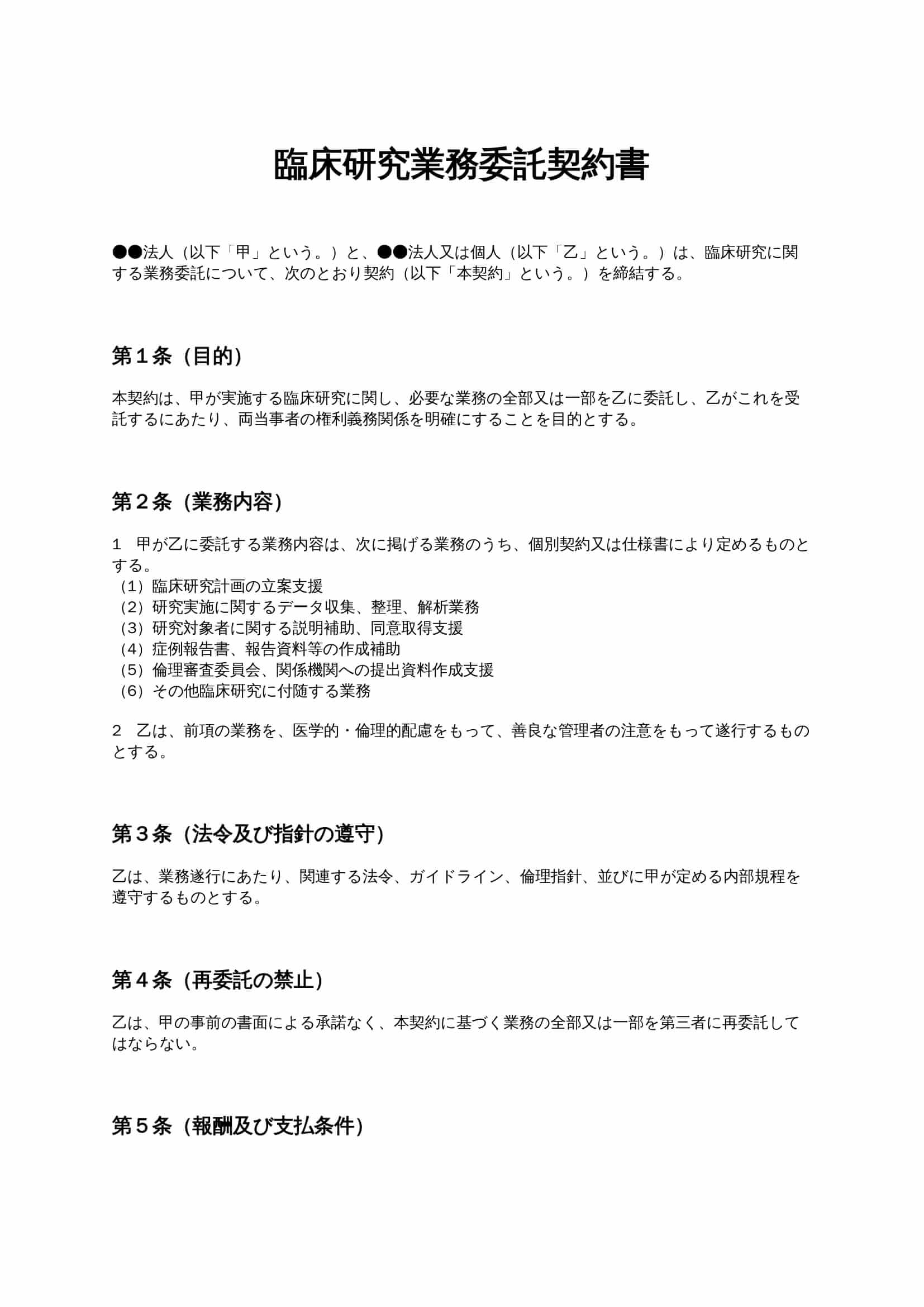 臨床研究業務委託契約書は、医療機関や研究機関が実施する臨床研究について、データ収集・解析、研究支援業務などを外部の専門家へ委託する際に用いる契約書です。業務範囲、報酬、秘密保持、成果物の帰属などを明確...