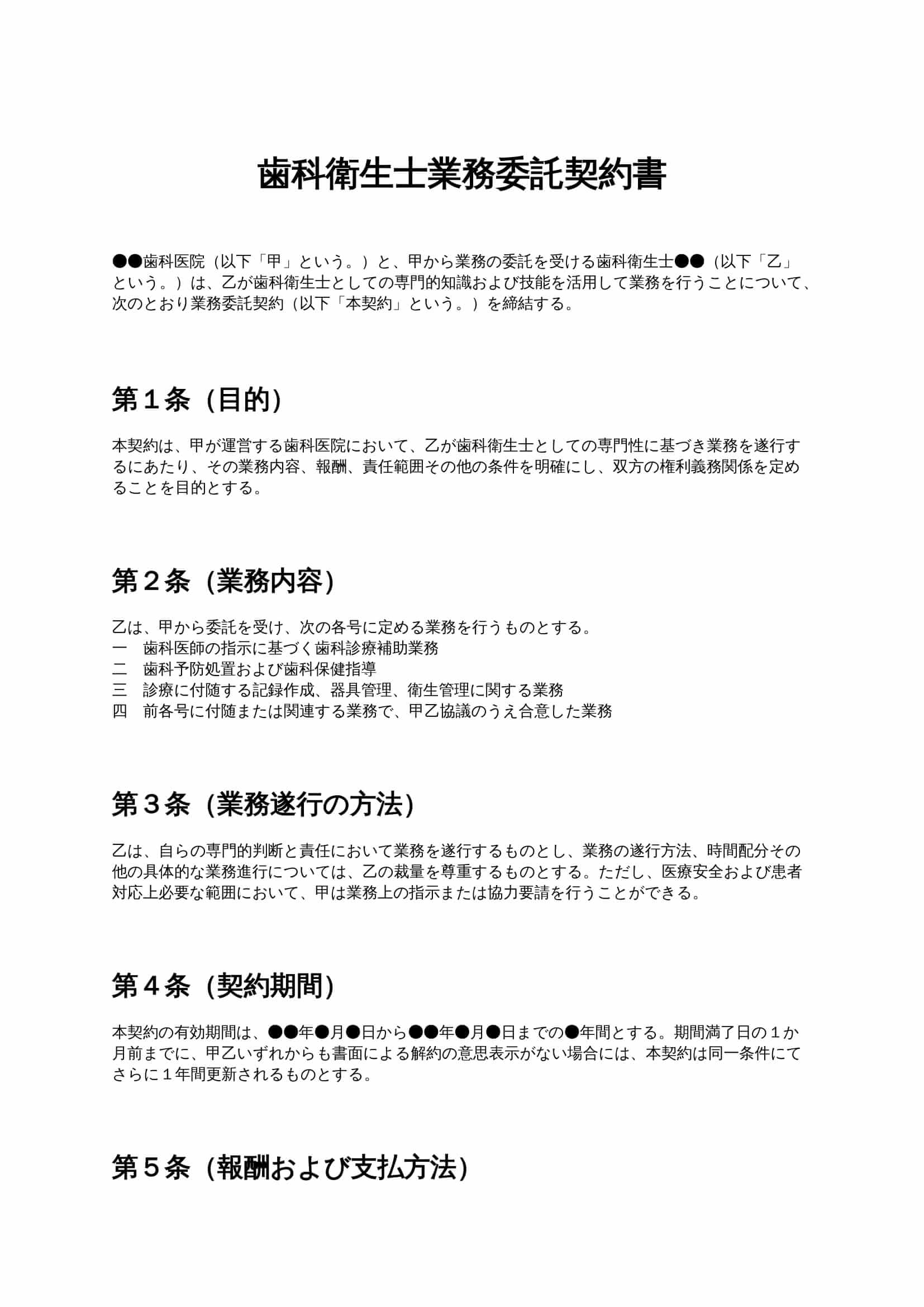 歯科衛生士業務委託契約書は、歯科医院が雇用契約ではなく業務委託として歯科衛生士に業務を依頼する際に、業務内容、報酬、責任範囲、秘密保持などを明確に定めるための契約書ひな形です。...