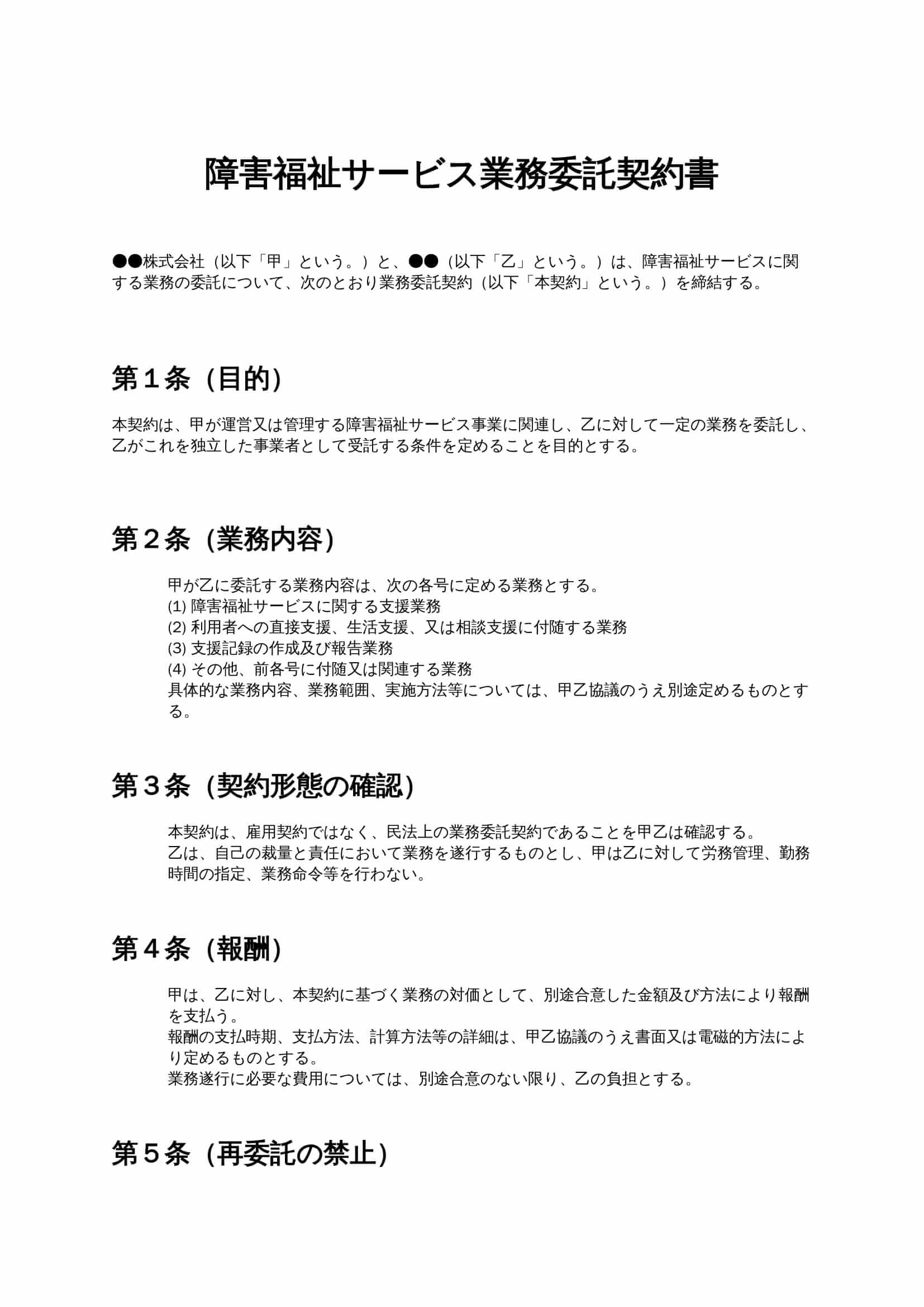 障害福祉サービス業務委託契約書は、障害福祉事業者が支援員や専門職など外部人材に業務を委託する際に、業務内容・報酬・責任範囲・個人情報の取扱いを明確に定めるための契約書です。...