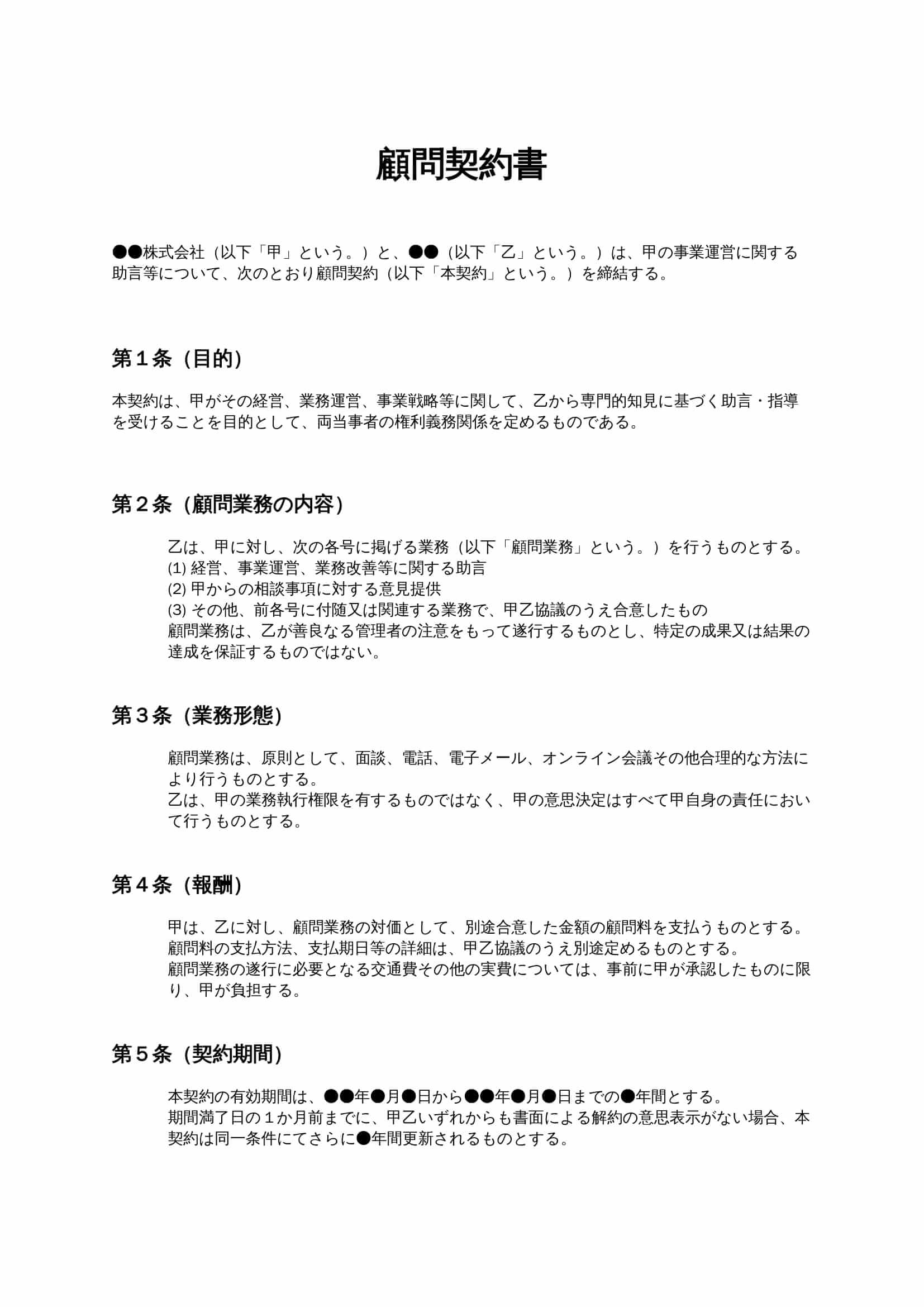 顧問契約書は、企業が外部の専門家から継続的に助言や指導を受ける際に締結する契約書です。経営・業務運営・戦略立案などについて、役割や報酬、責任範囲を明確にし、顧問関係におけるトラブルを防止します。...
