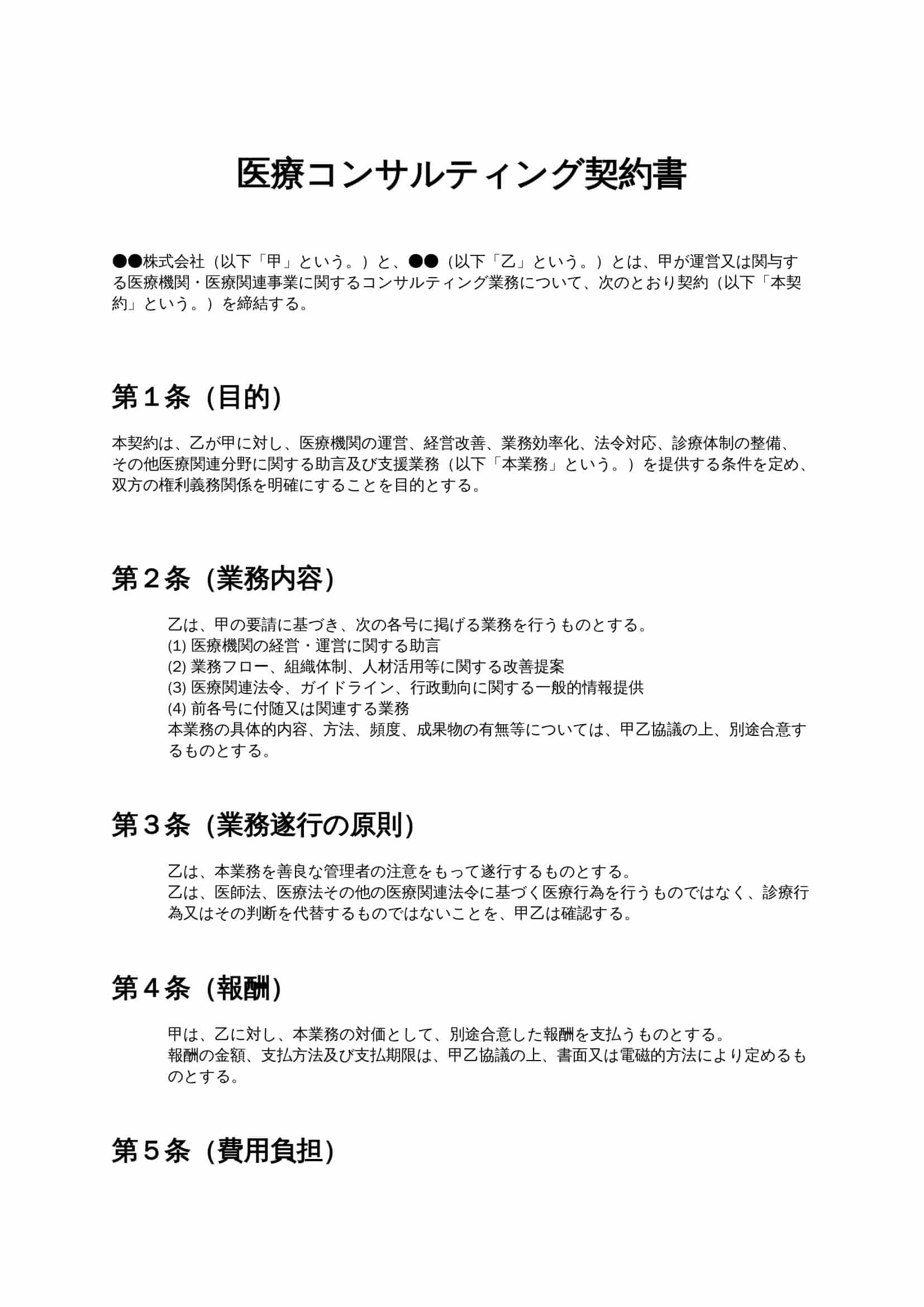 医療コンサルティング契約書は、医療機関や医療関連事業者が、経営改善や業務効率化、法令対応などの助言を専門家から受ける際に、業務内容や責任範囲、報酬条件を明確にするための契約書です。...