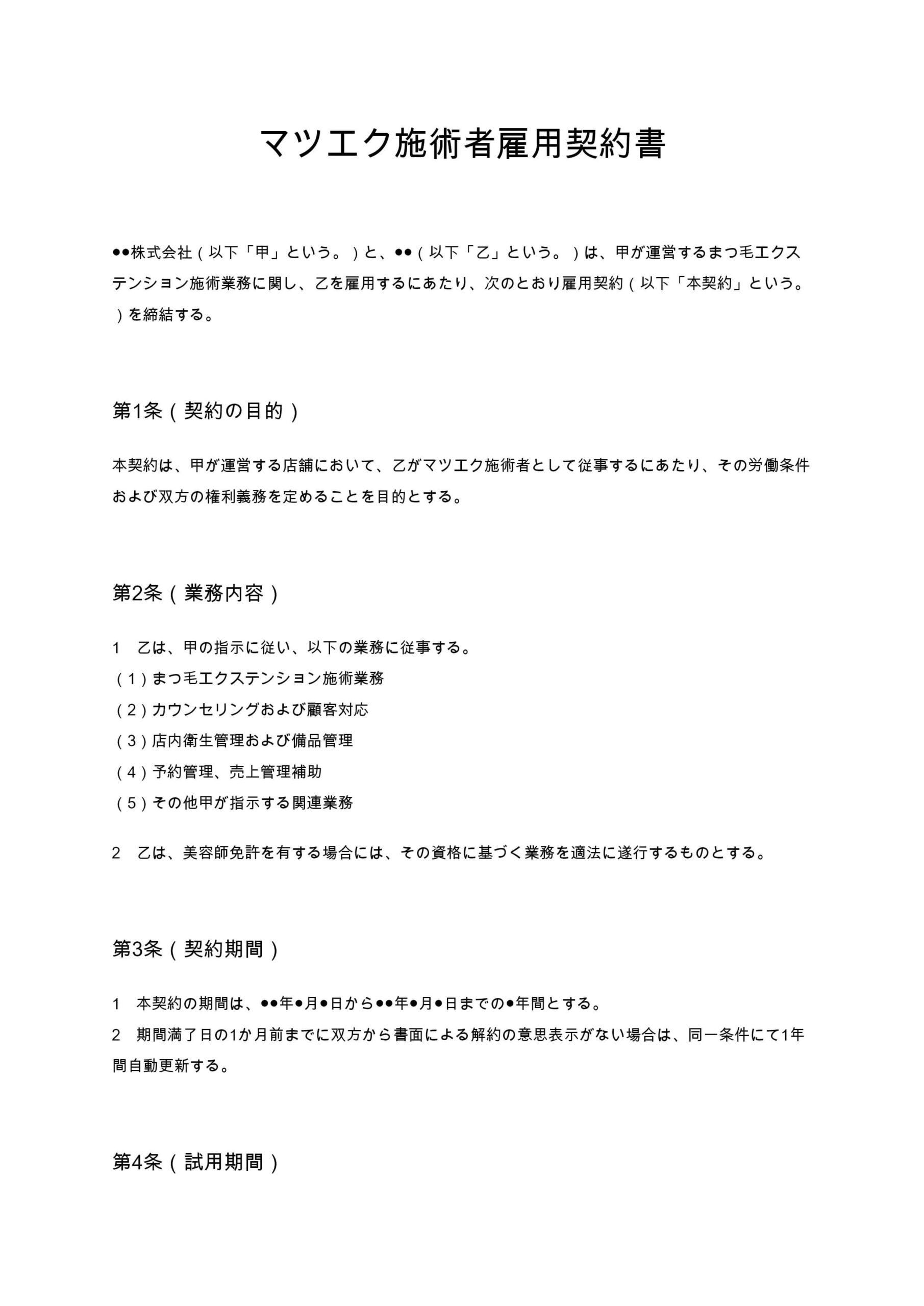 マツエク施術者雇用契約書は、まつ毛エクステンション施術者を雇用する際の労働条件や歩合制度、衛生管理、秘密保持義務などを体系的に整理した契約書ひな形です。...