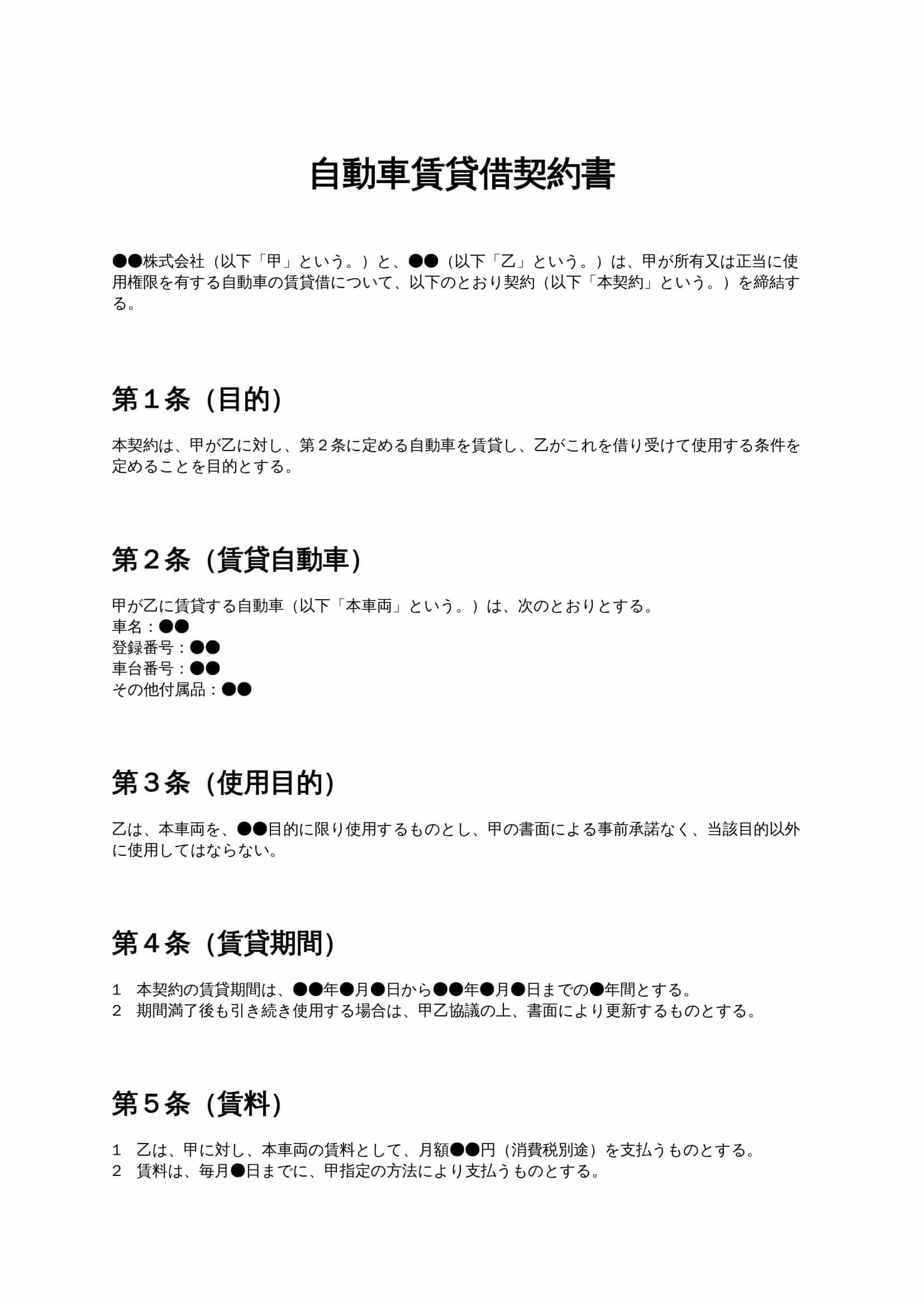 自動車賃貸借契約書は、車両の所有者が第三者に一定期間自動車を貸与する際に、賃料、使用目的、管理責任、事故時対応、返還条件などを明確に定めるための契約書です。 ...