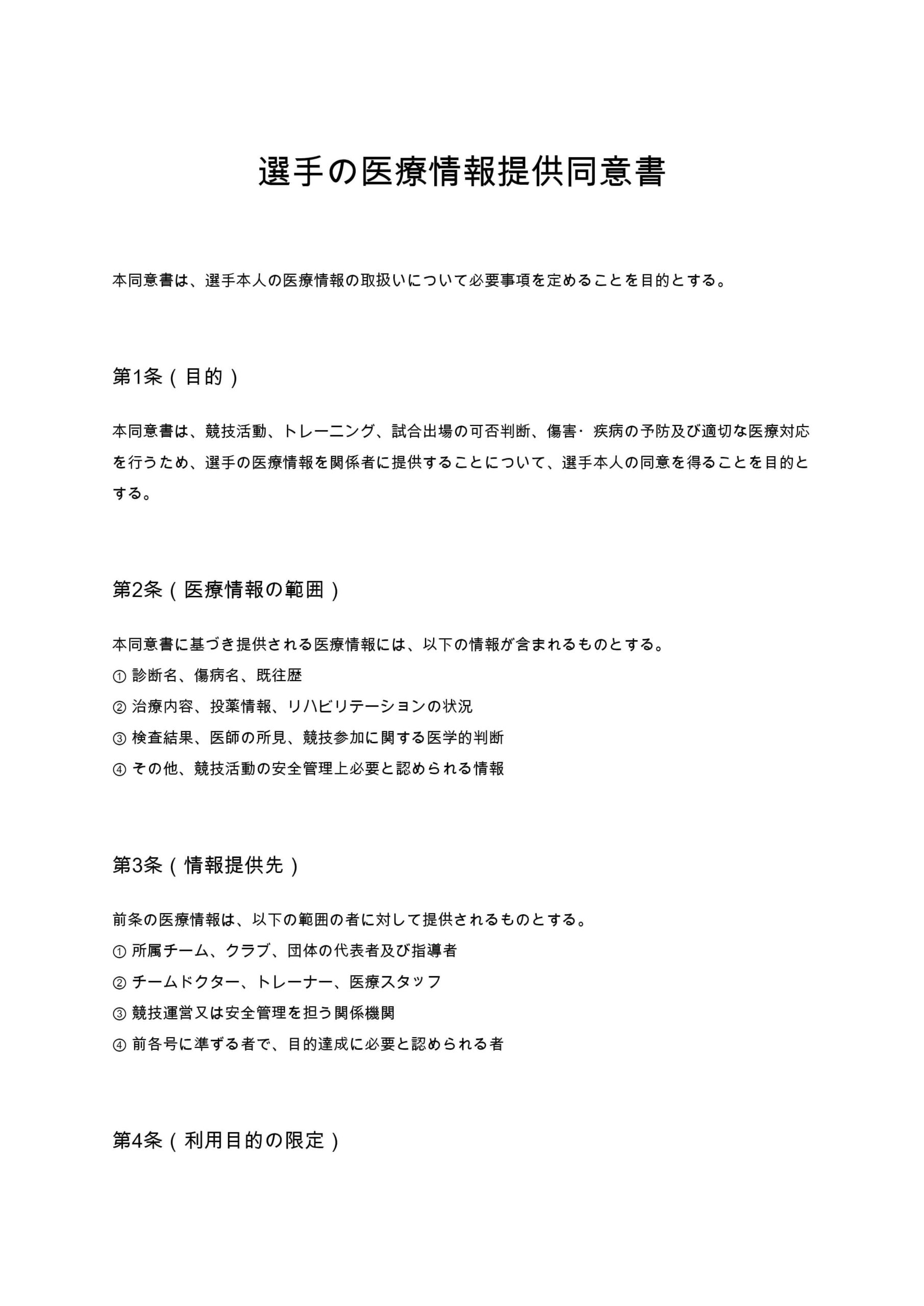 選手の医療情報提供同意書は、競技活動や安全管理を目的として、診断内容や治療状況などの医療情報をチームや医療スタッフへ提供することについて、選手本人の同意を明確にする書面です。...