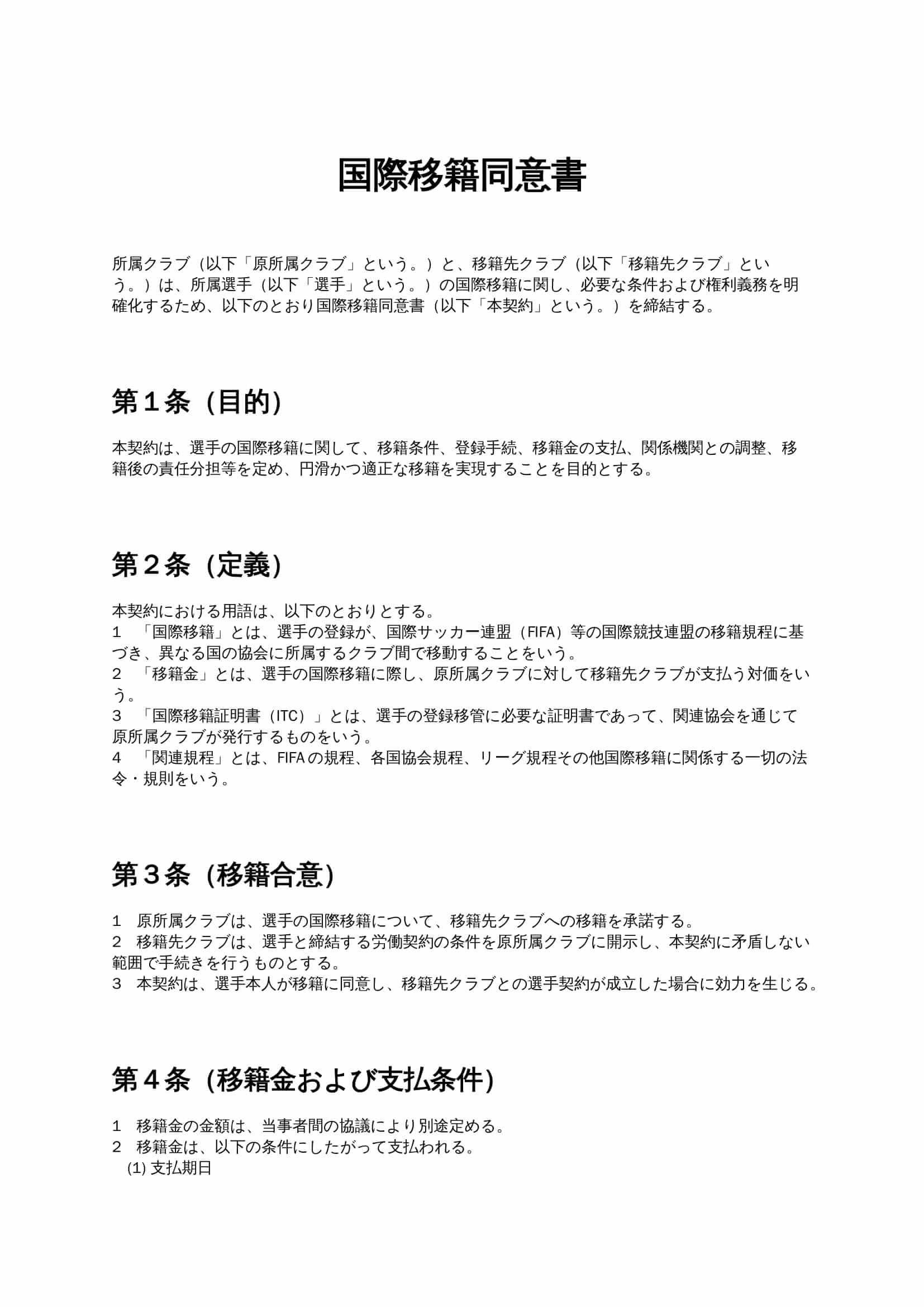 国際移籍同意書は、プロアスリートが国境を越えて移籍する際に、原所属クラブ・移籍先クラブ・選手の三者間で移籍条件、手続、移籍金、ITC発行、責任分担を明確に定めるための文書です。国際移籍を円滑かつ適正に...