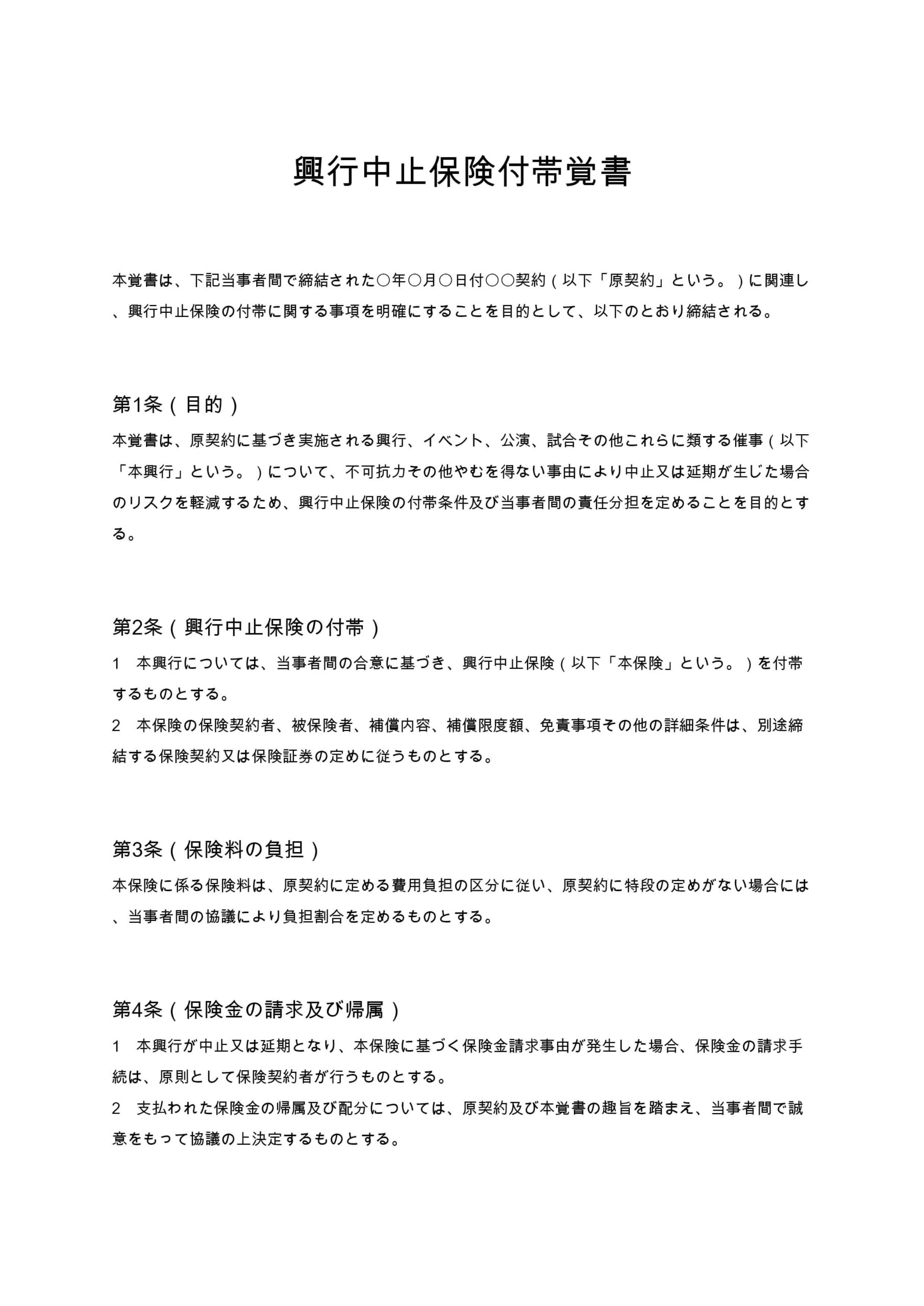 興行中止保険付帯覚書は、イベントや公演、試合などの興行が不可抗力により中止・延期となった場合に備え、興行中止保険の付帯条件や保険金の取扱い、当事者間の責任分担を明確にするための覚書です。原契約と併せて...