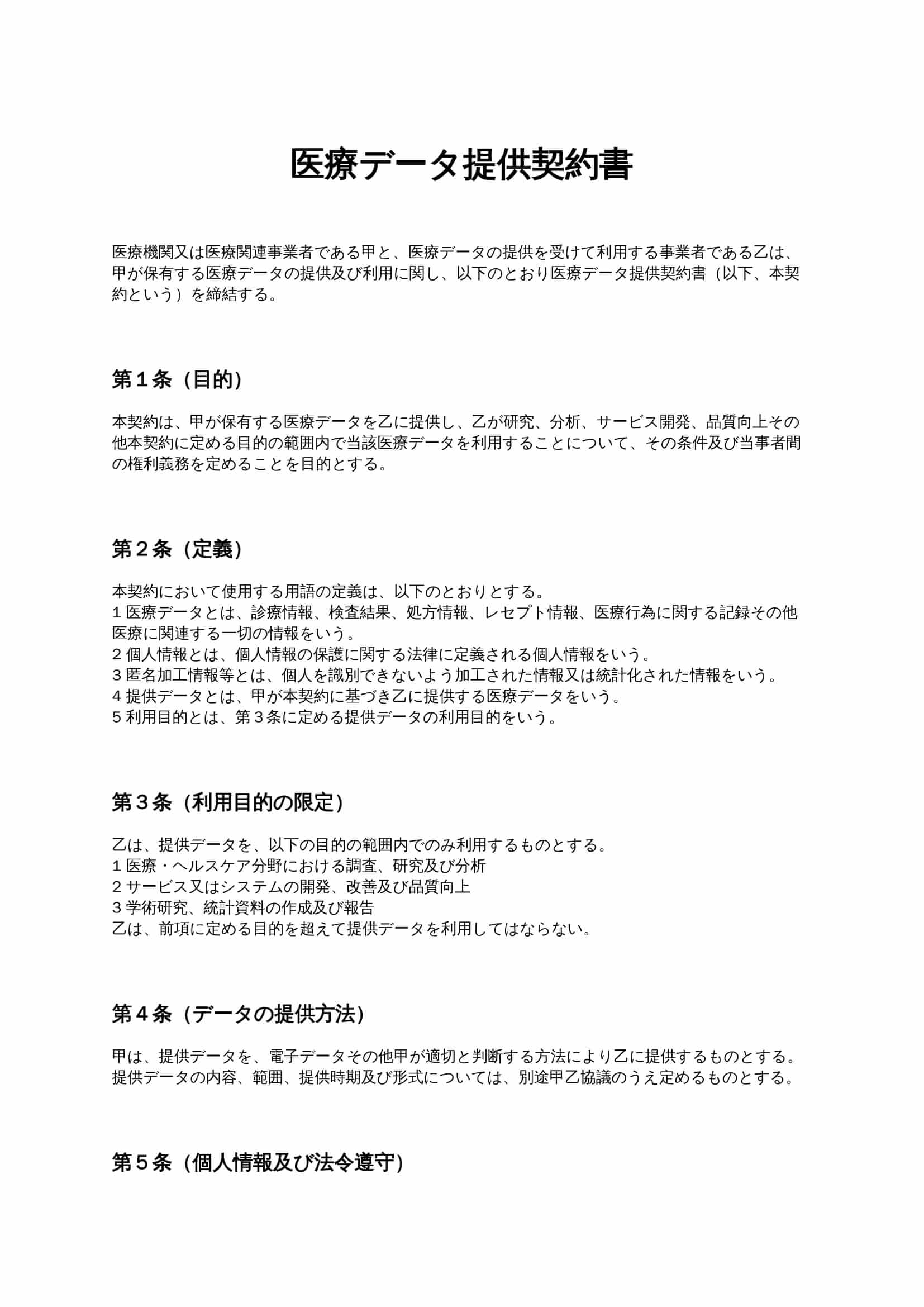 医療データ提供契約書は、医療機関等が保有する医療データを、研究・分析・サービス開発などの目的で第三者に提供する際に、利用目的や管理方法、責任範囲を明確に定めるための契約書です。個人情報保護や安全管理措...