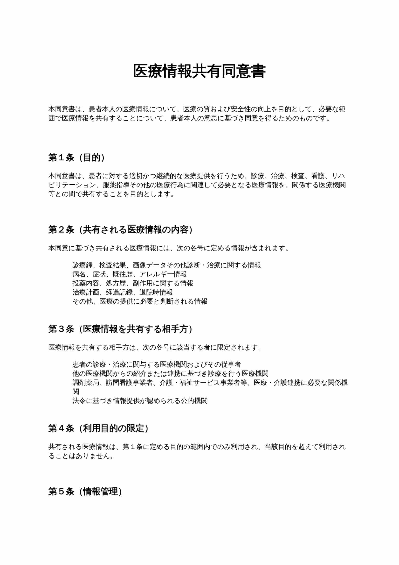 医療情報共有同意書は、患者本人の同意に基づき、診療・治療・検査などに必要な医療情報を医療機関や関係機関間で共有するための書面です。医療連携や継続的な治療を安全かつ円滑に行う目的で利用されます。 ...