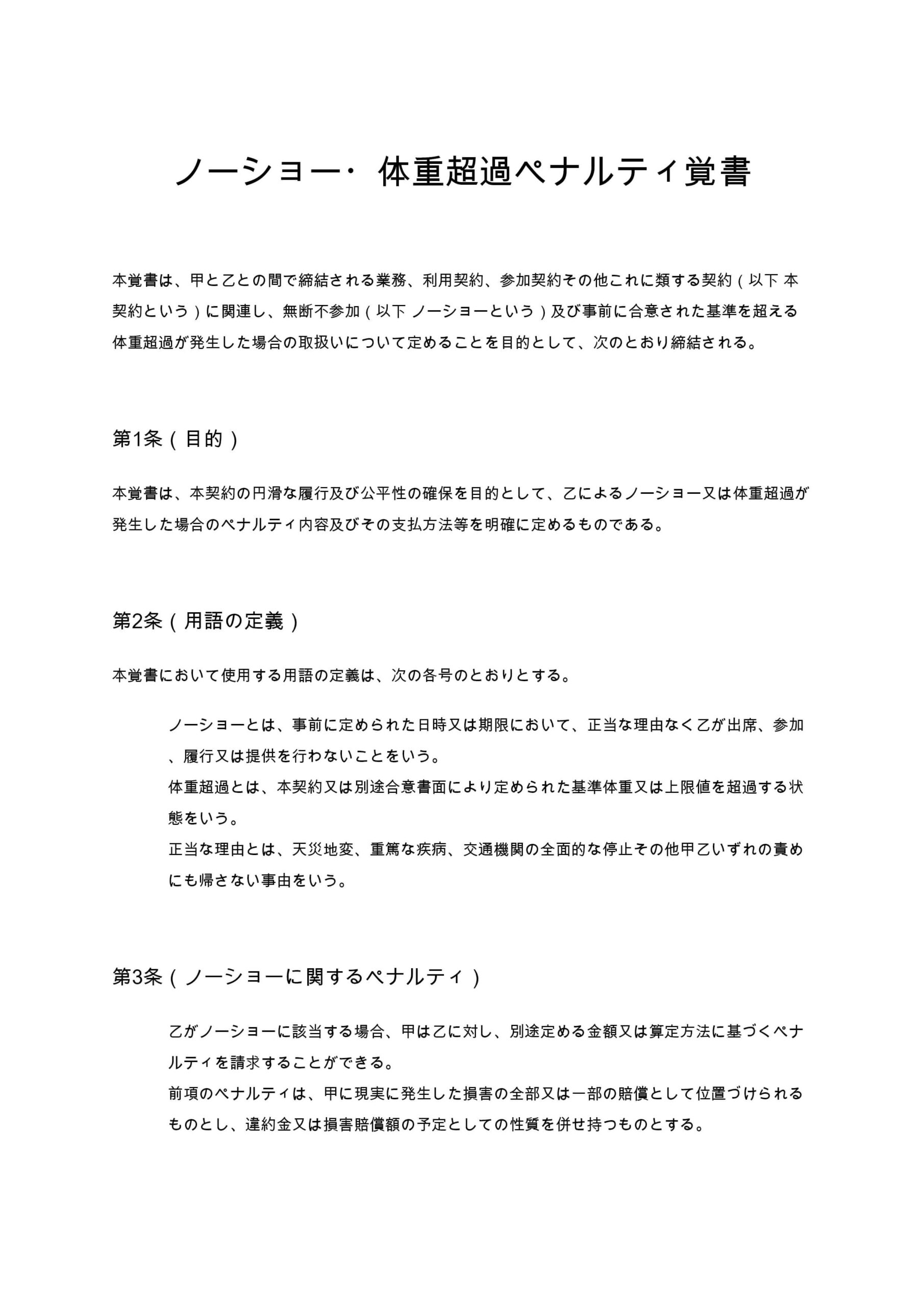 ノーショー・体重超過ペナルティ覚書は、無断不参加や合意基準を超える体重超過が発生した場合のペナルティ内容、算定方法、支払条件を明確に定め、契約運営の公平性とトラブル防止を目的とした覚書ひな形です。...