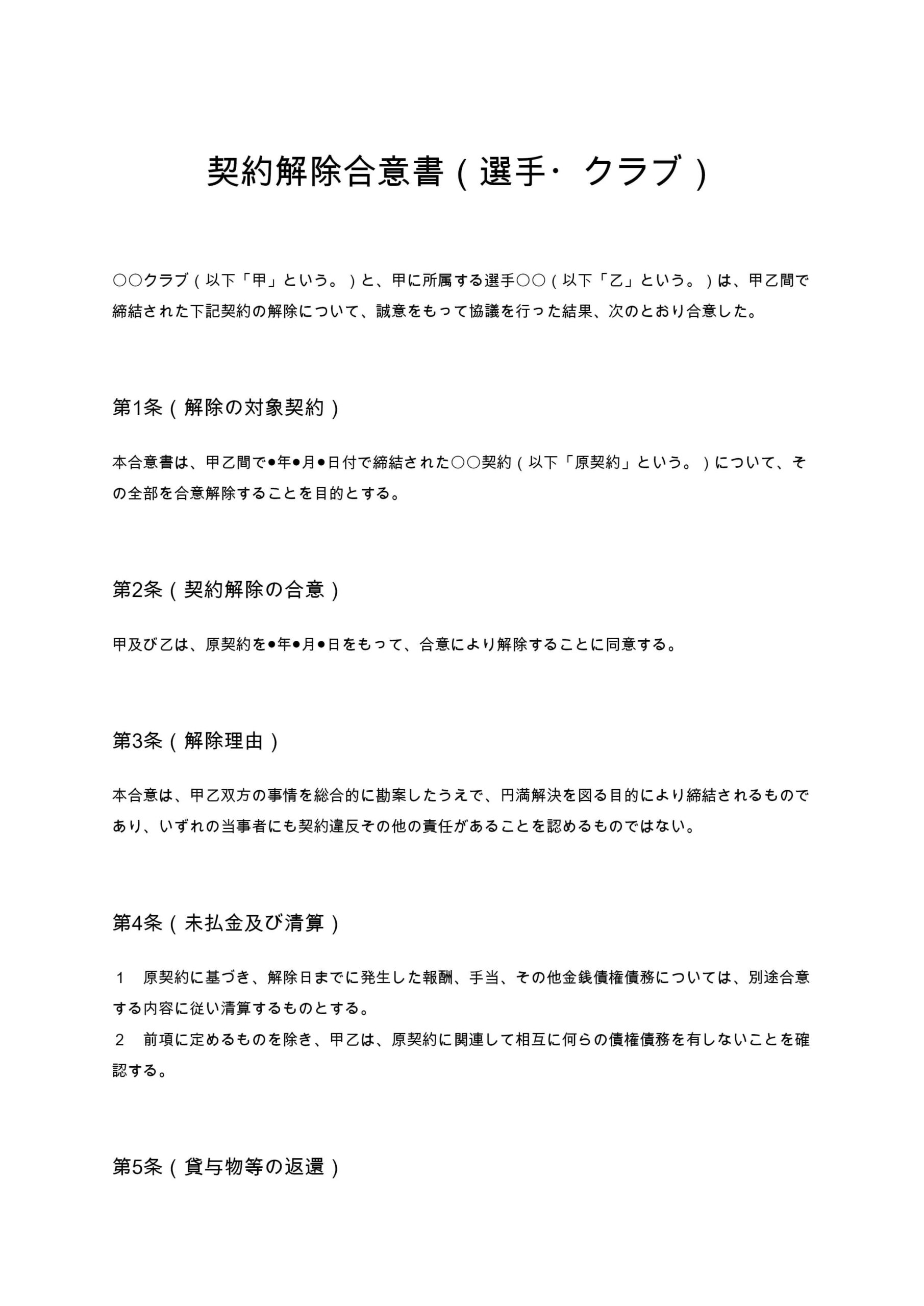 契約解除合意書(選手・クラブ)は、スポーツ選手とクラブとの間で締結された所属契約や業務契約を、双方合意のもと円満に解除するための書面です。解除日、清算、守秘義務などを明確にし、将来の紛争防止を目的とし...