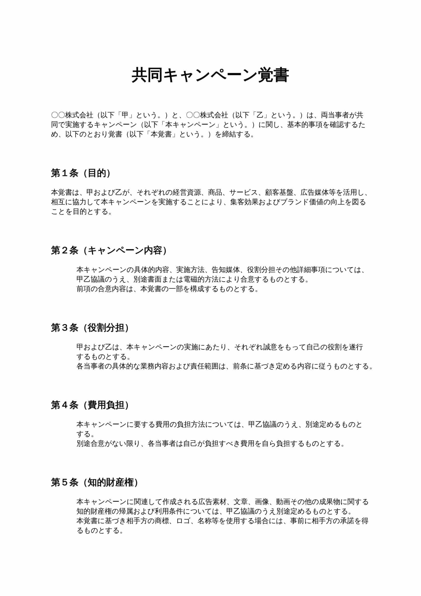 共同キャンペーン覚書は、企業同士が販促や集客を目的として共同でキャンペーンを実施する際に、役割分担や費用、知的財産権、秘密保持などの基本事項を整理するための文書です。...