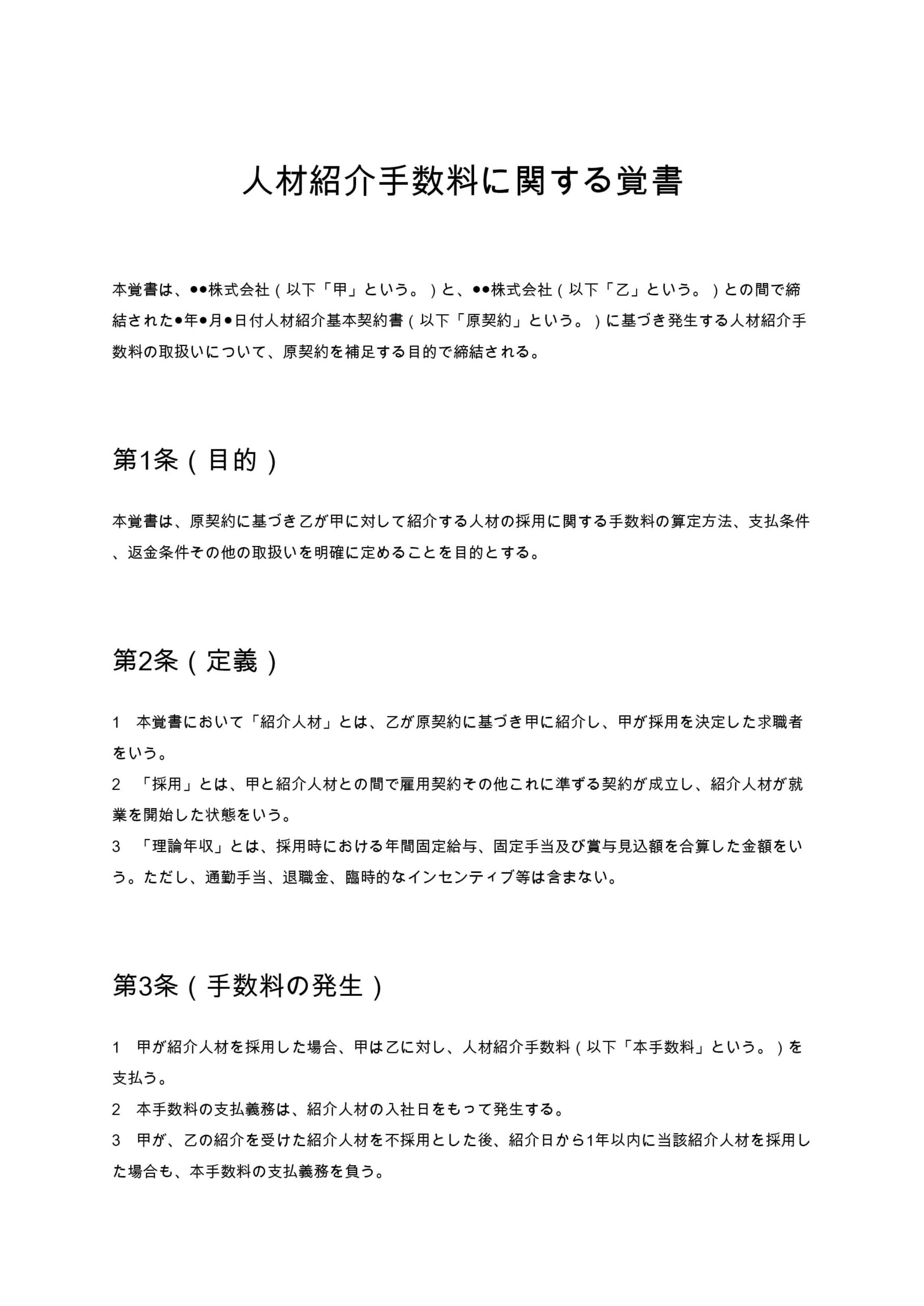 人材紹介手数料に関する覚書は、人材紹介契約に基づく成功報酬の算定方法、支払条件、早期退職時の返金基準などを明確化するための補足契約書です。採用トラブルの防止と金銭条件の透明化に役立ちます。...