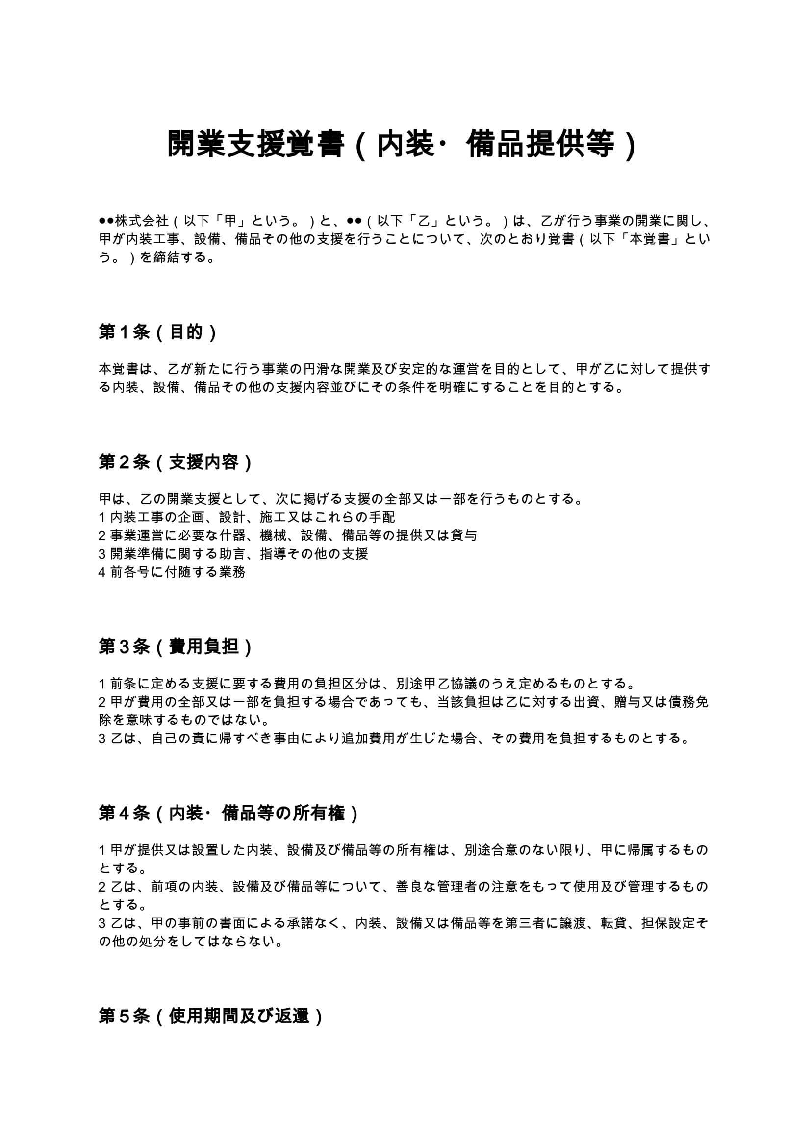 開業支援覚書(内装・備品提供等)は、事業開業にあたり支援者が内装工事や設備・備品の提供、助言などを行う際の条件や責任範囲を明確にするための覚書です。費用負担、所有権、返還条件を整理し、後日のトラブルを...