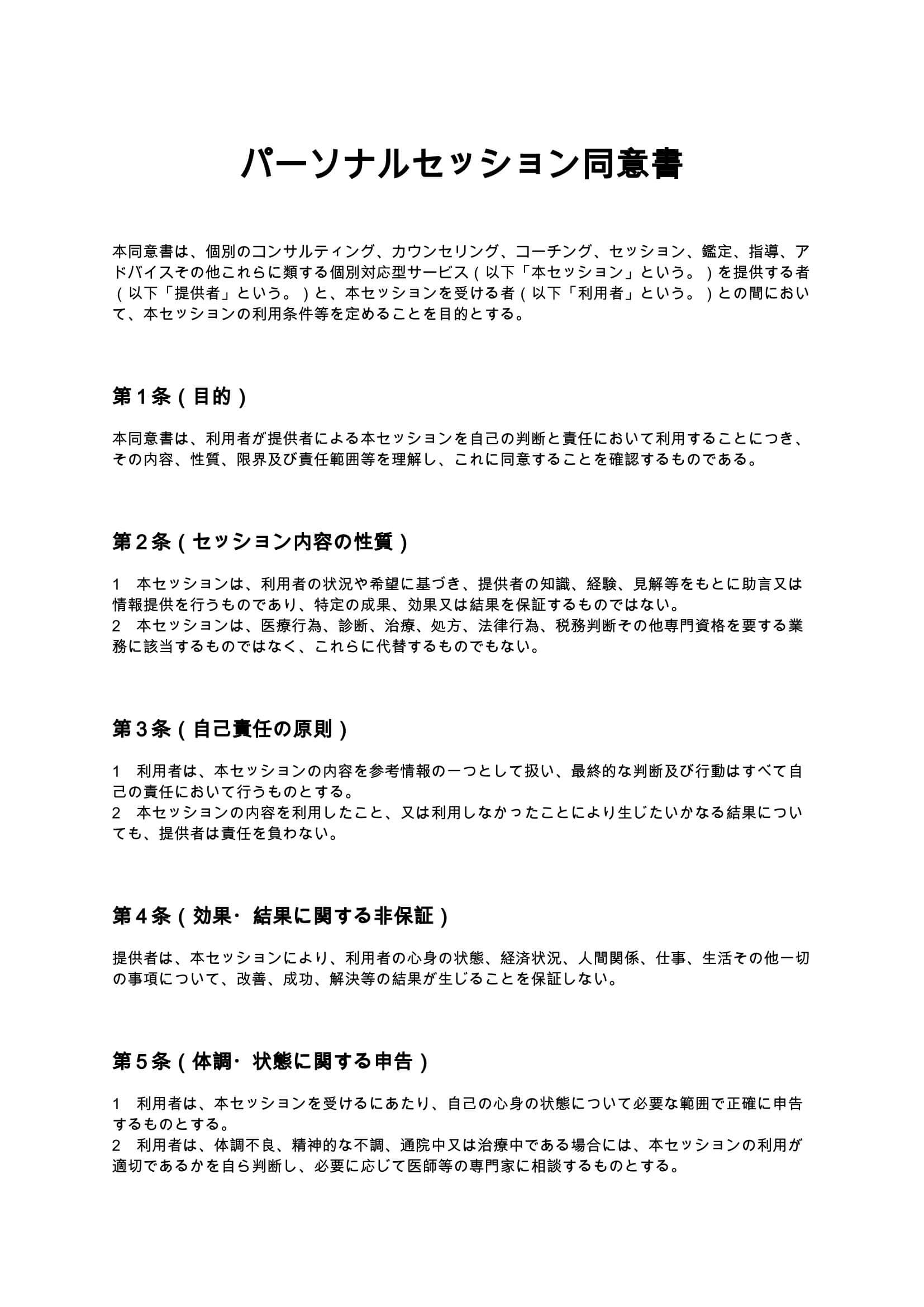 パーソナルセッション同意書は、コンサルティングやカウンセリング、コーチングなどの個別セッションにおいて、サービスの性質や責任範囲、免責事項を事前に明確化するための同意書です。トラブル防止と信頼性確保を...