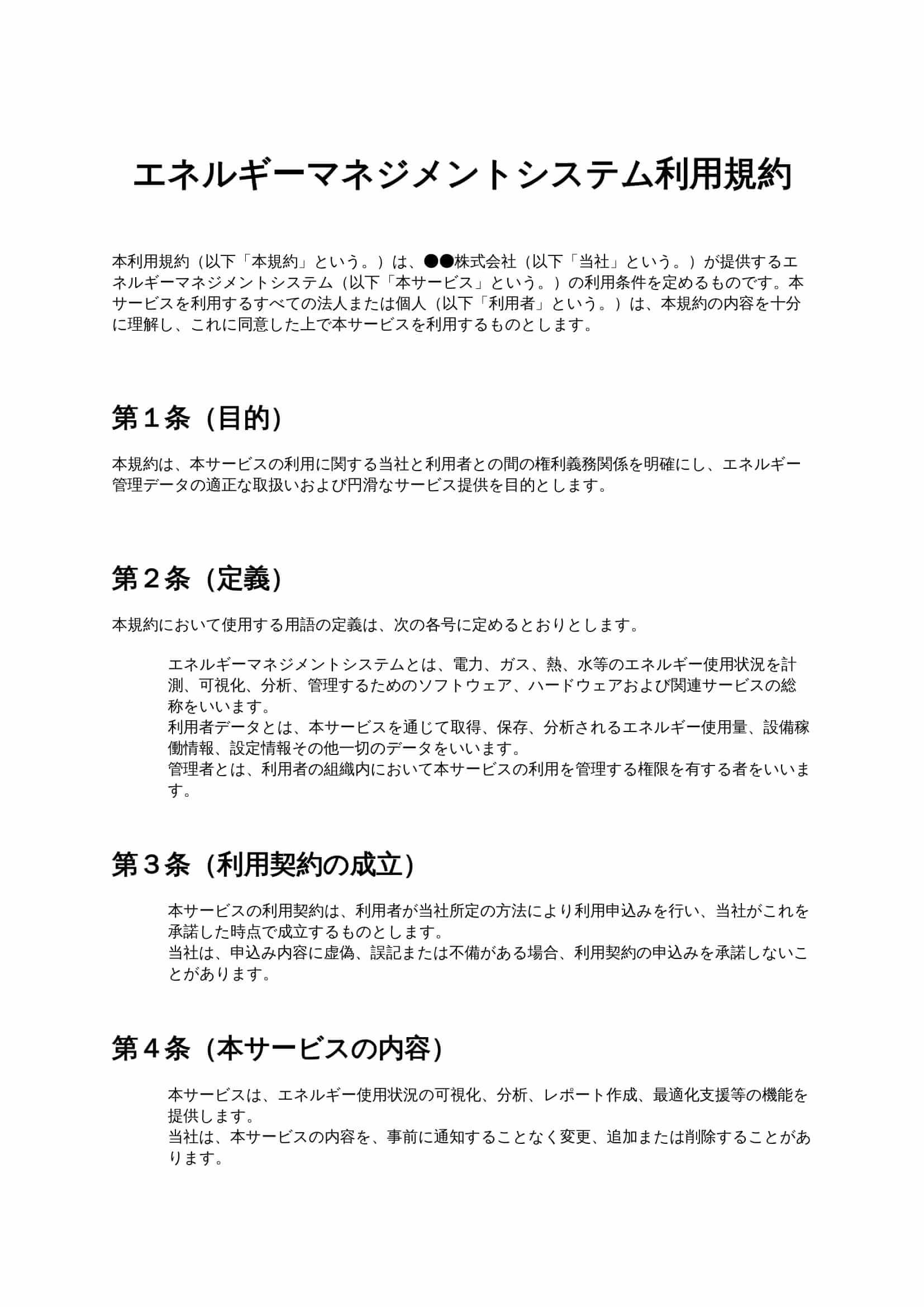 エネルギーマネジメントシステム利用規約は、電力やガスなどのエネルギー使用データを可視化・分析するシステムを提供する事業者が、利用条件や責任範囲、データの取扱いを明確にするための規約ひな形です。BEMS...