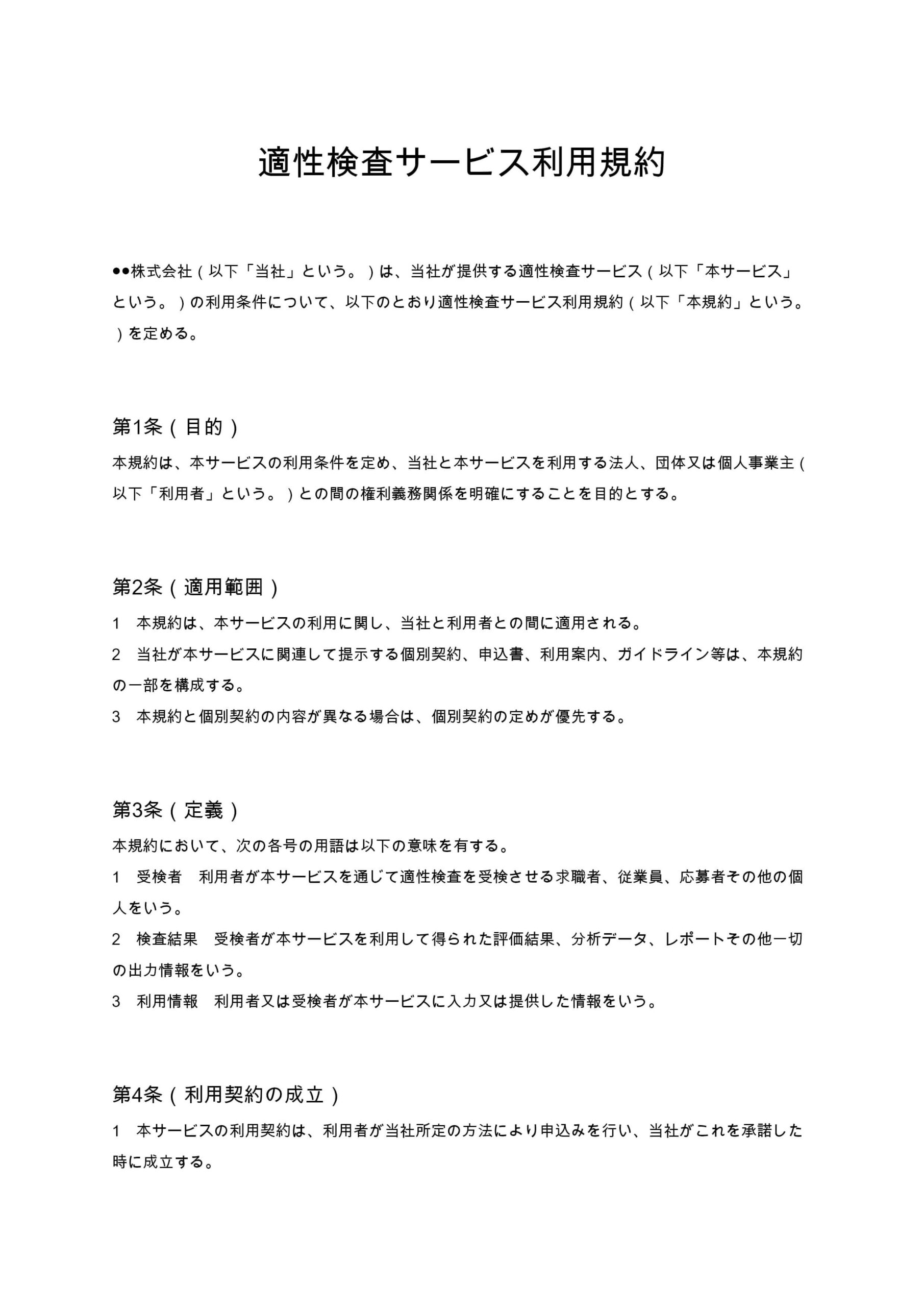 適性検査サービス利用規約は、企業が提供するオンライン適性検査の利用条件、知的財産権、個人情報保護、責任制限などを体系的に定めた実務対応型の規約ひな形です。...