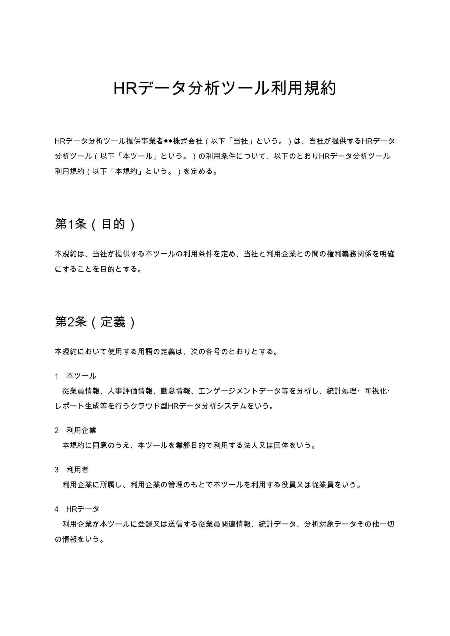 HRデータ分析ツール利用規約は、人事データをクラウド上で分析・可視化するサービスの利用条件を定めた規約です。個人情報保護、知的財産権、責任制限、データ削除まで網羅的に整理した実務対応型のひな形です。...