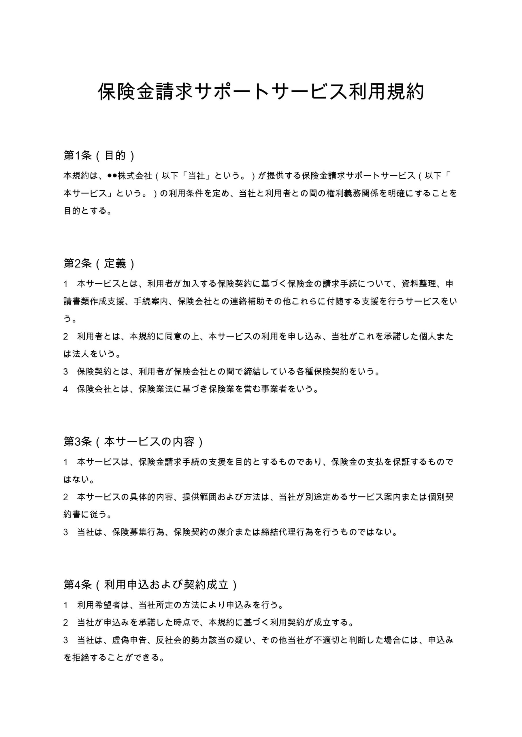保険金請求サポートサービス利用規約は、保険金請求の書類作成支援や手続案内を行う事業者と利用者との間の権利義務を明確にし、責任範囲や免責事項を整理した実務対応型の規約です。...