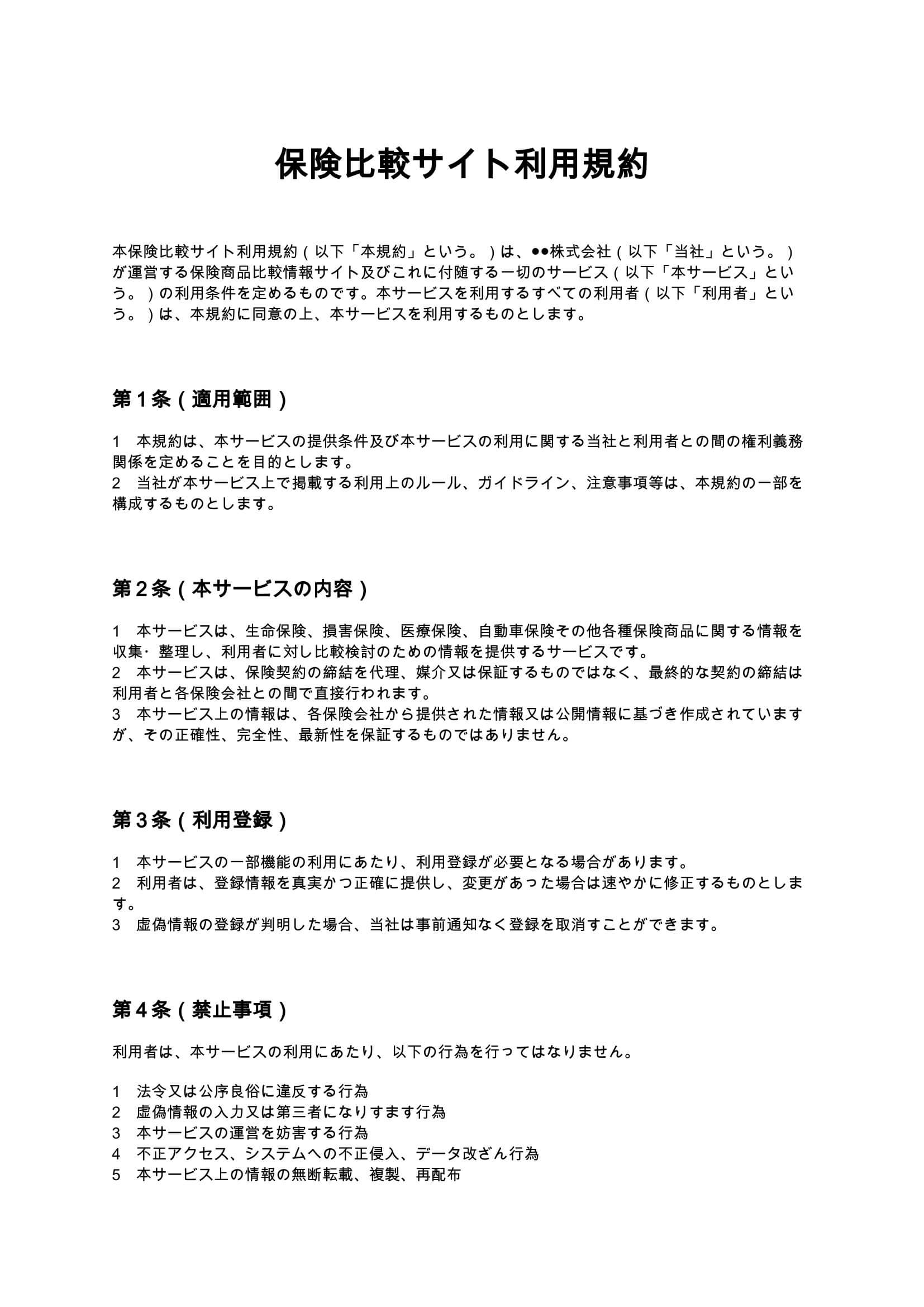 保険比較サイト利用規約は、生命保険や損害保険等の比較情報を提供するWebサービスにおける利用条件、免責範囲、禁止事項、知的財産権の帰属などを体系的に定めた規約ひな形です。...