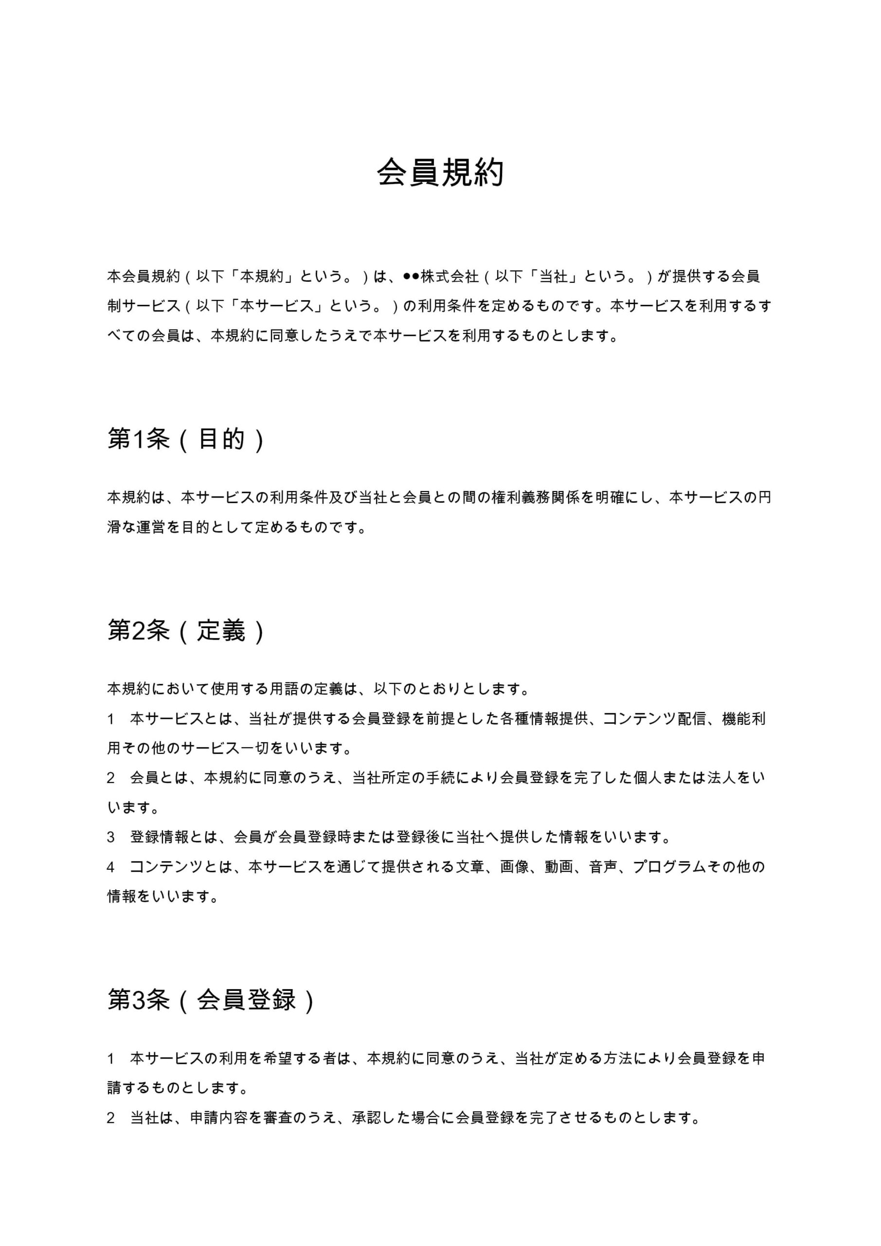 会員規約(会員制サービス向け)は、オンラインサロンやサブスクリプション型サービスなどにおいて、会員登録条件、利用ルール、禁止事項、免責事項等を明確に定めるための規約ひな形です。運営者と会員双方の権利義...