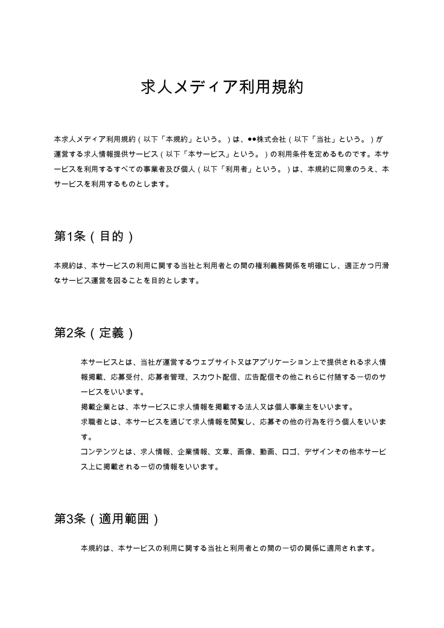 求人メディア利用規約は、求人情報の掲載、応募管理、個人情報の取扱い、料金、禁止事項などを包括的に定める規約です。掲載企業と運営者双方の責任範囲を明確化し、トラブルを未然に防ぐための実務対応型ひな形です...